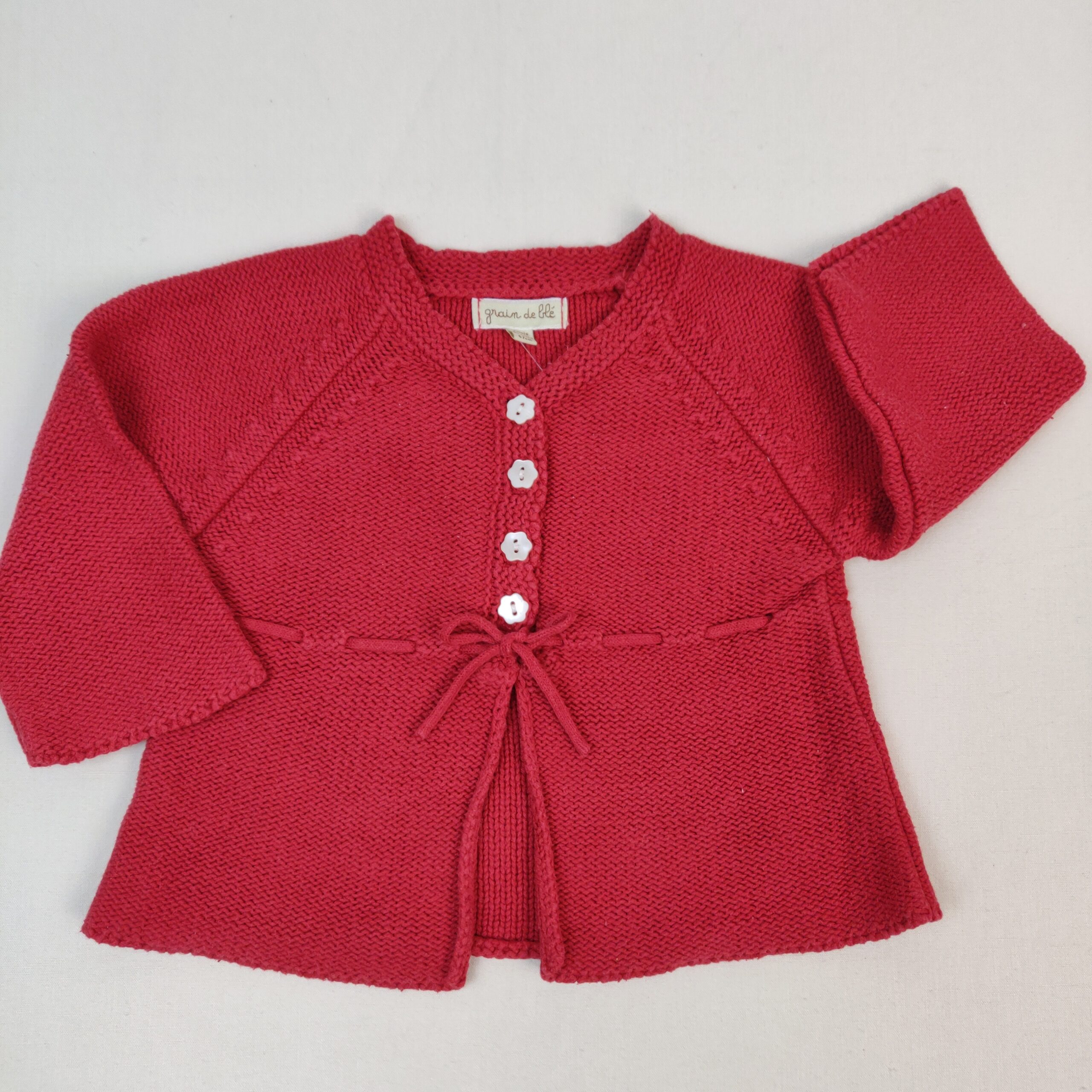 Autres commentaires : 38% Acrylique – Gilet manches longues en maille rouge, col v, forme évasée, fermeture par boutons fleurs et cordelette rouge.