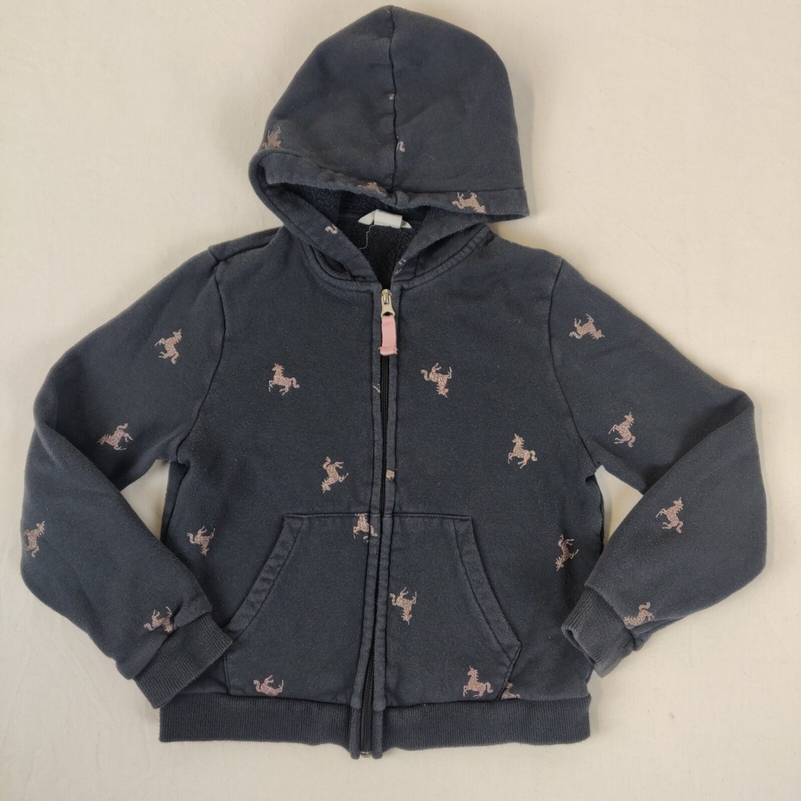 Autres commentaires : 20% polyester. Gilet à capuche – gris foncé avec motifs pailletés cuivrés licornes. Ouverture centrale zippée. Deux poches latérales. Usure normale.