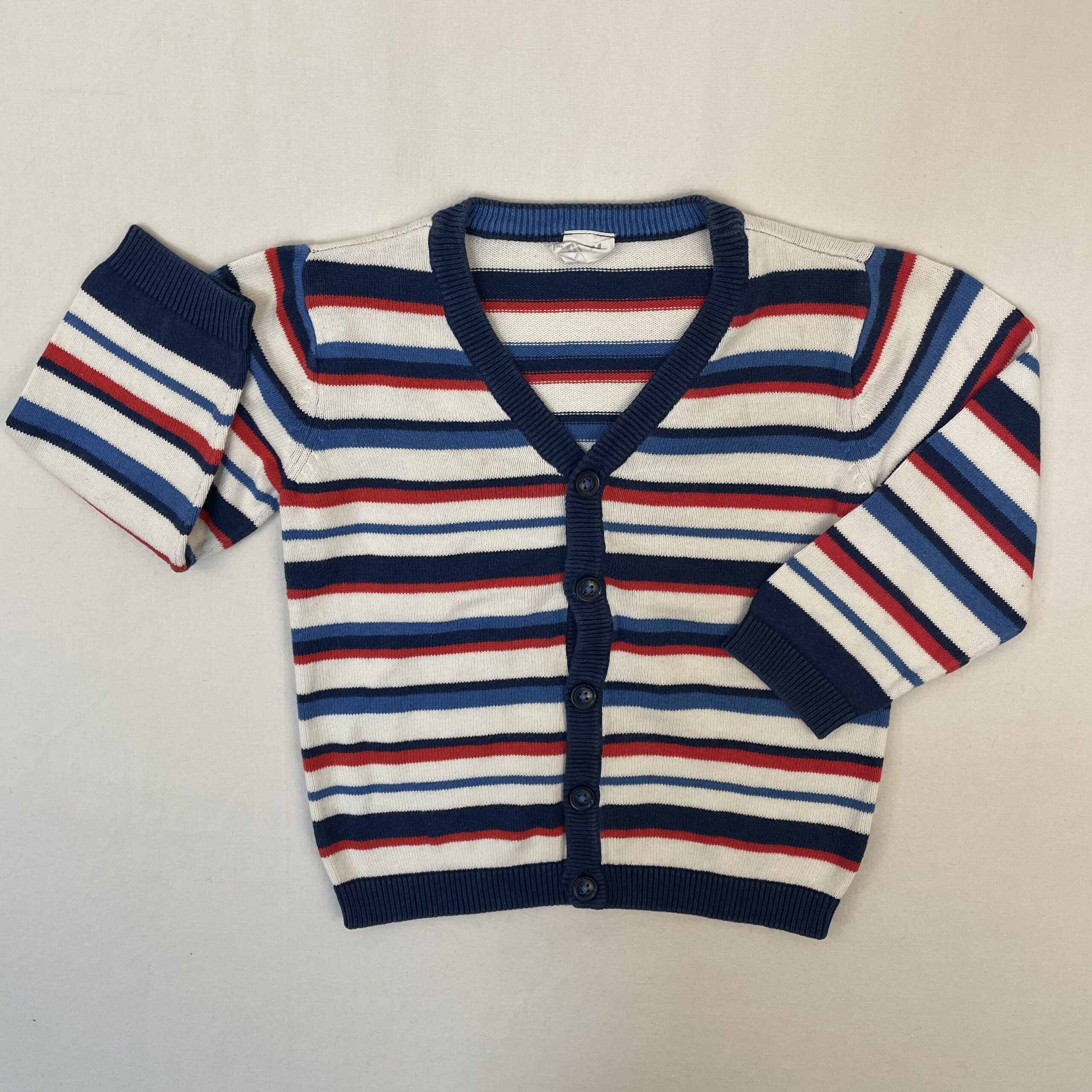 - Gilet en maille blanc cassé à rayures bleues et rouges, col V, fermeture devant par boutons classiques.