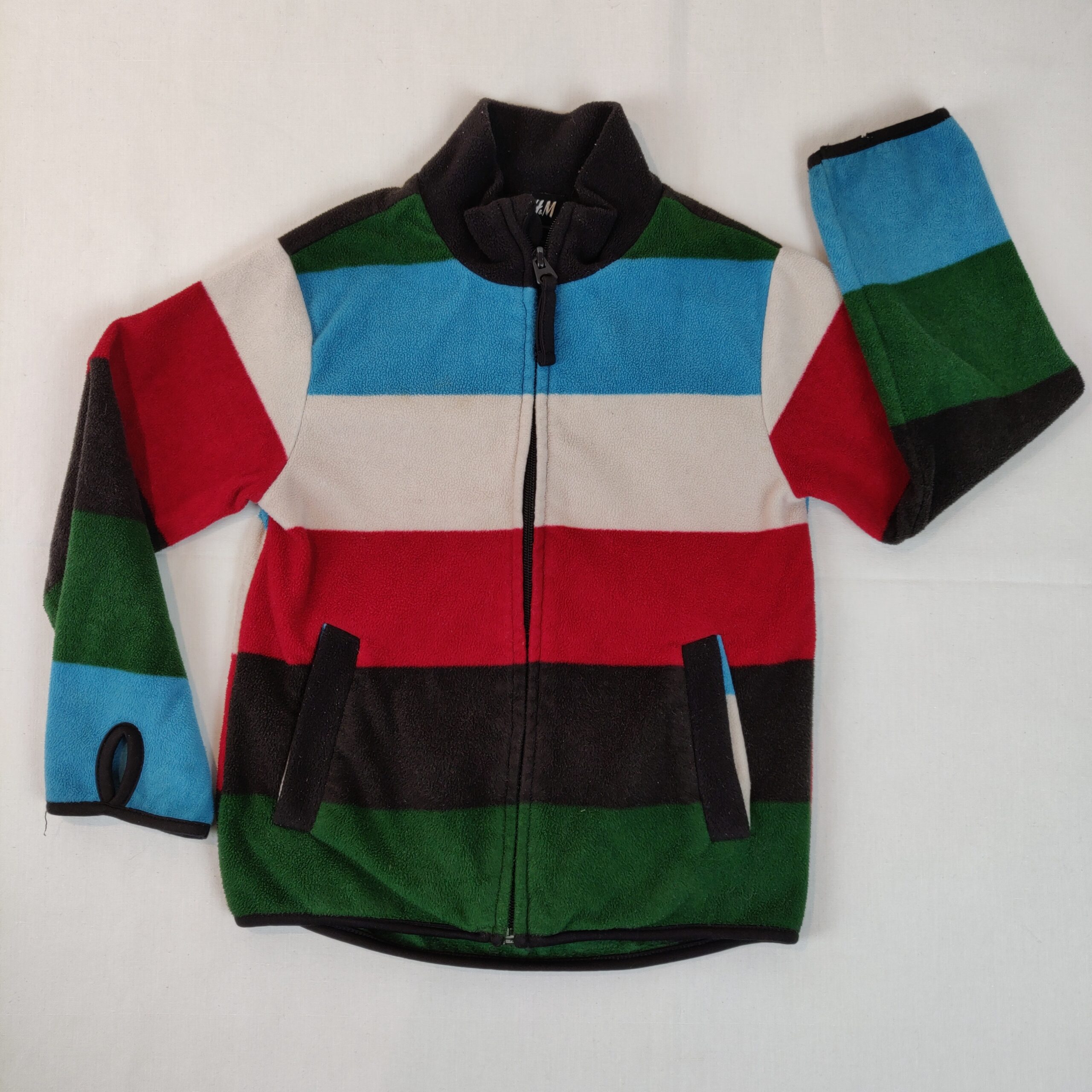 Autres commentaires : Gilet en polaire à manches longues mitaines (échancrure pour le pouce) – bandes vertes, marrons, bleues, blanches et rouges. Ouverture centrale à fermeture éclair. 2 poches latérales. Usure normale liée à la matière.