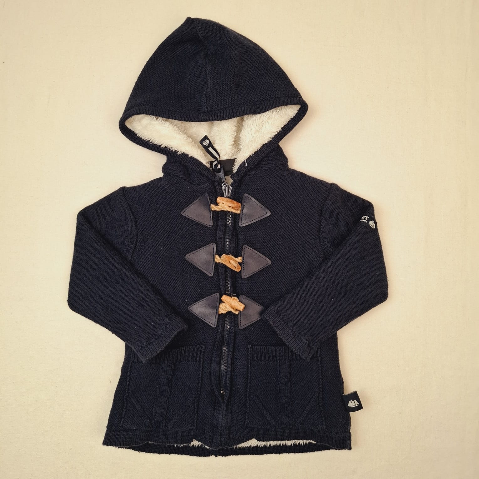 Autres commentaires : 50% acrylique. Gilet marin à capuche, fermeture par zip et duffle coat, doublure en imitation fourrure.