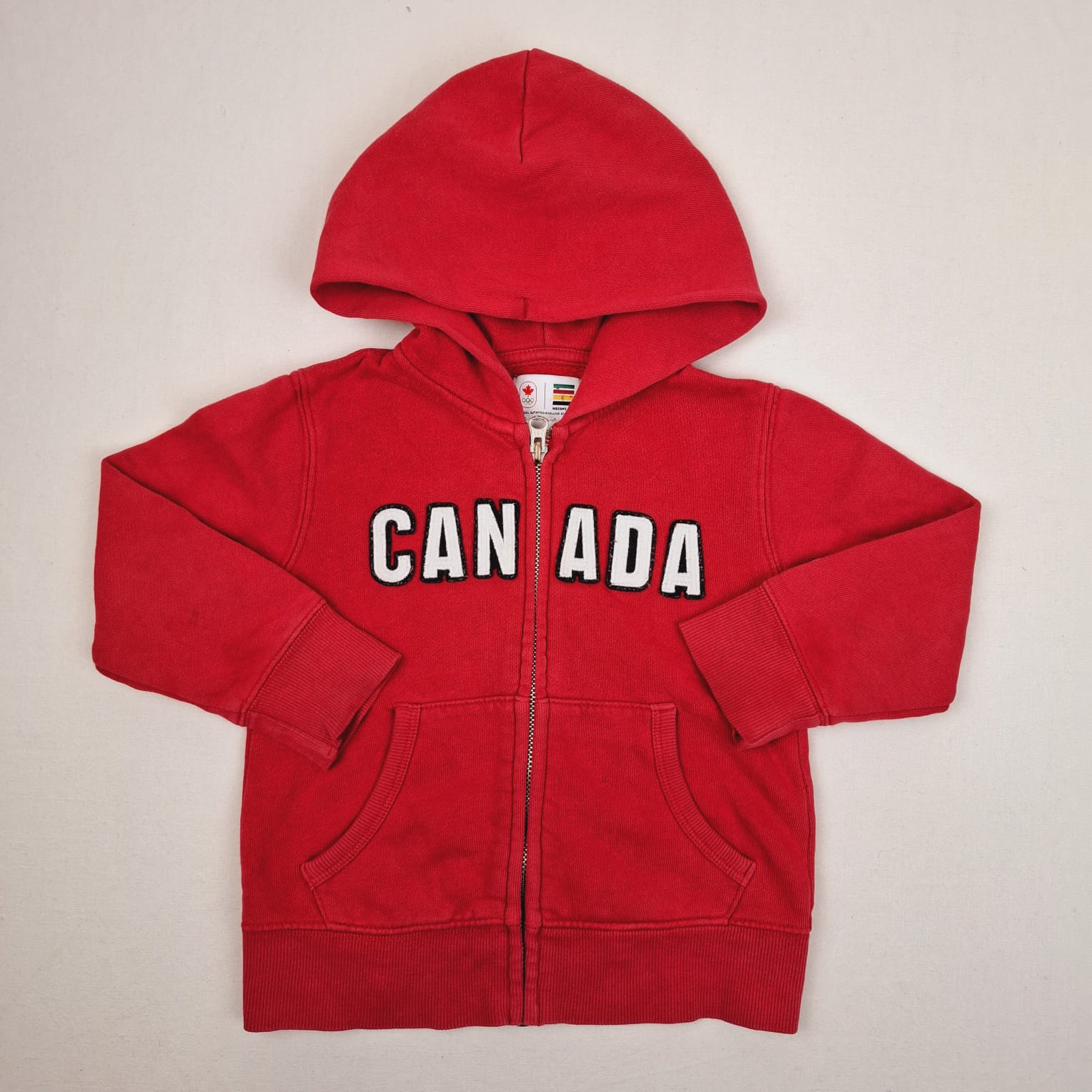 Autres commentaires : 15% polyester. Gilet rouge à capuche, doubluré chaud, inscription « Canada », bordures côtelées.
