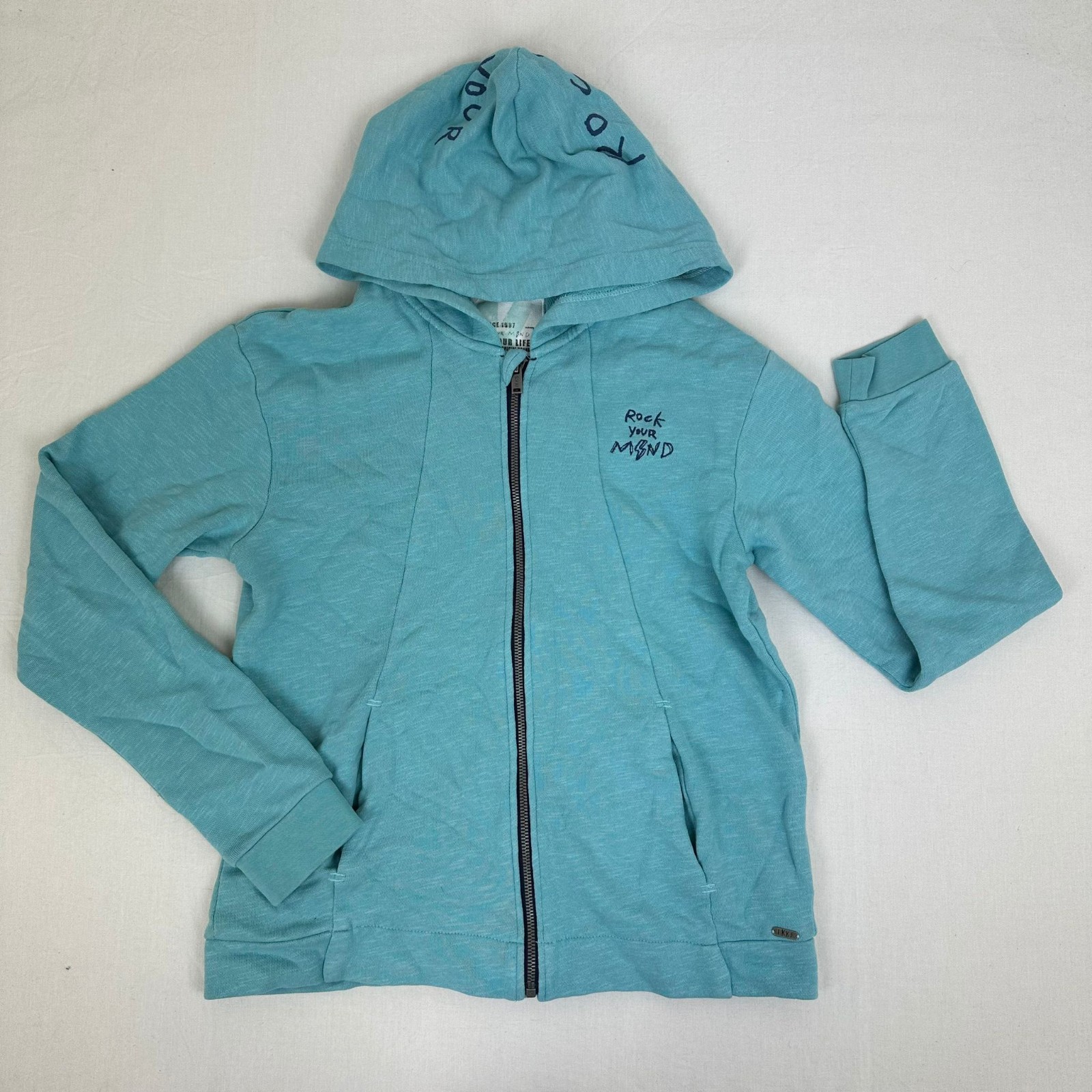 Autres commentaires : Gilet manches longues bleu avec capuche, 2 poches latéraux et une fermeture en zip.