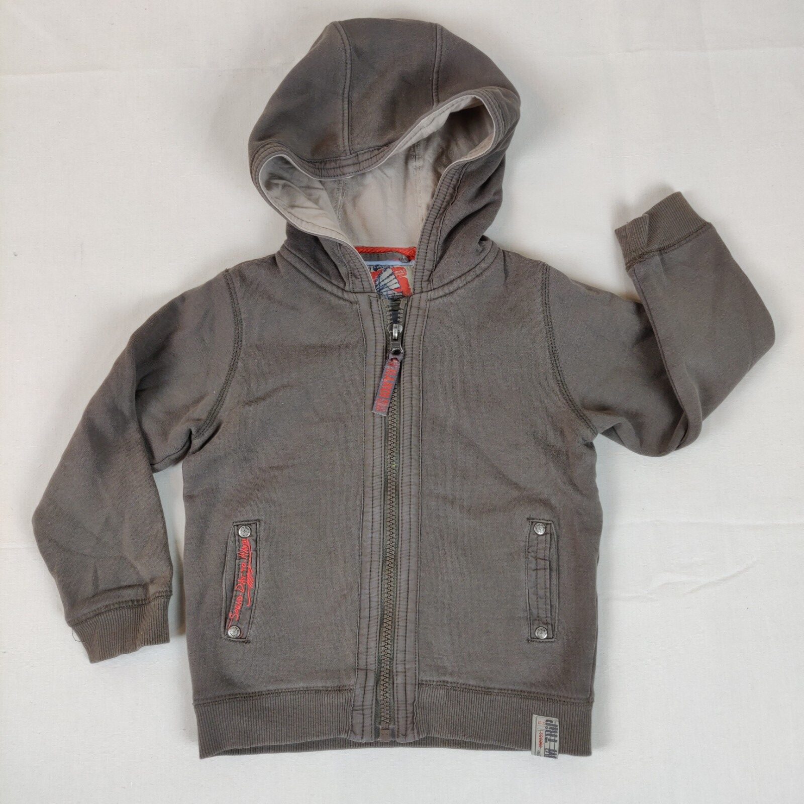 Autres commentaires : Gilet à capuche – vert kaki. Ouverture centrale à zip. 2 poches latérales ornées de rivets dont une inscription orange sur la poche gauche » Spend day to Hanoï ». Ecusson beige cousu à la taille avec inscription « Vietnam trip ».