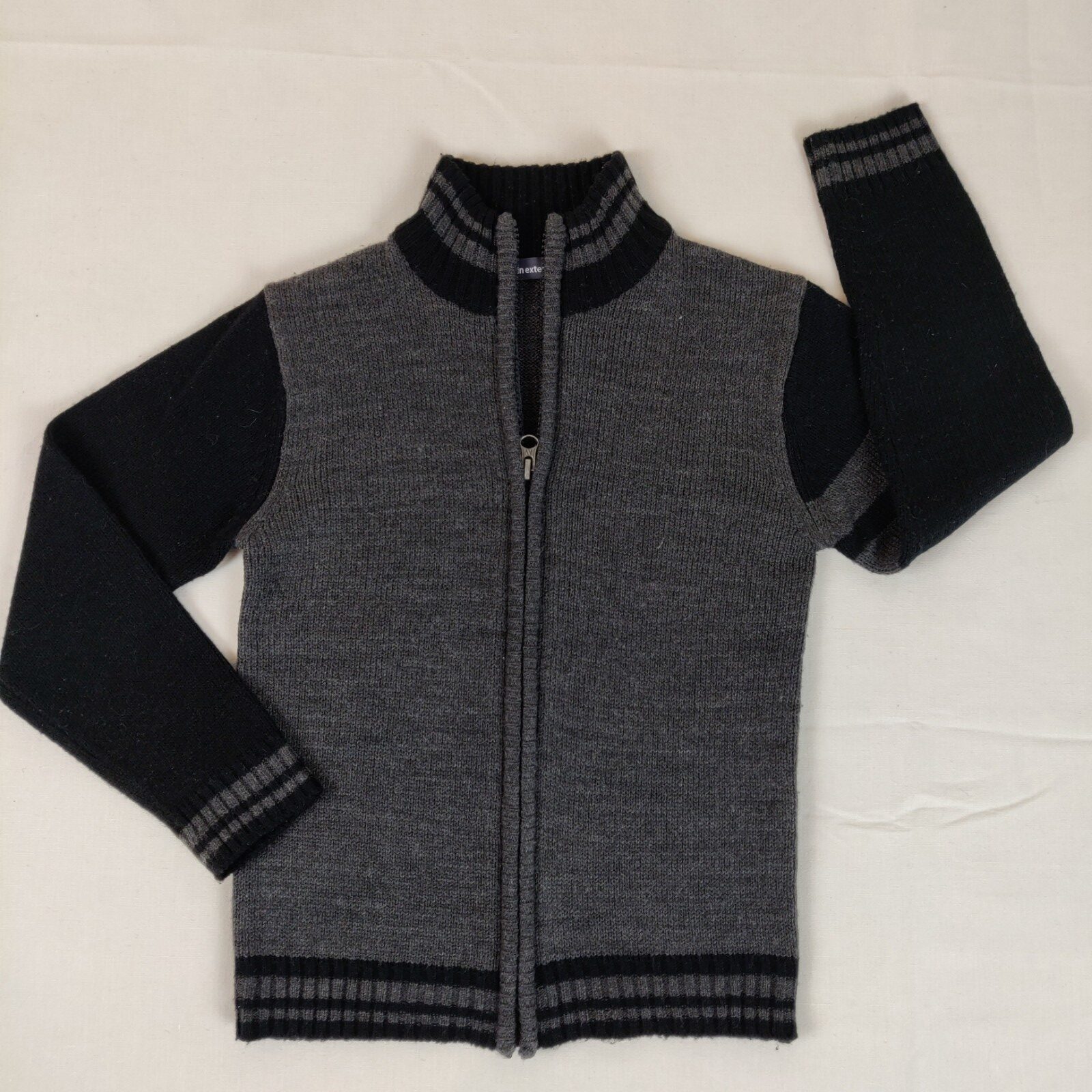 Autres commentaires : Gilet en mailles – gris foncé et manches noires avec pour celle de gauche des rayures grises. Ouverture centrale à fermeture éclair. Col, poignets et taille élastiques noirs avec des rayures grises.
