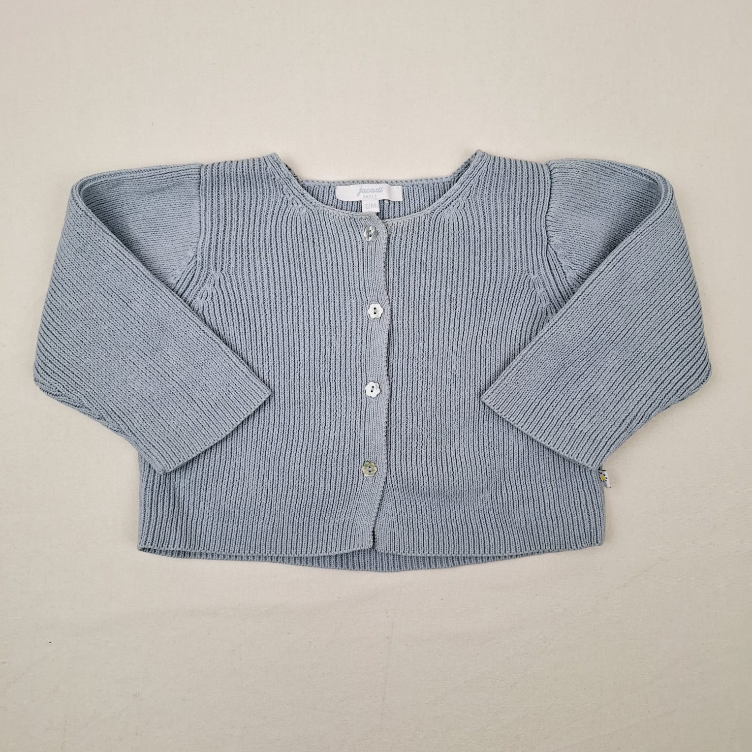Autres commentaires : Gilet tricoté bleu clair uni, col rond, fermeture par boutons.