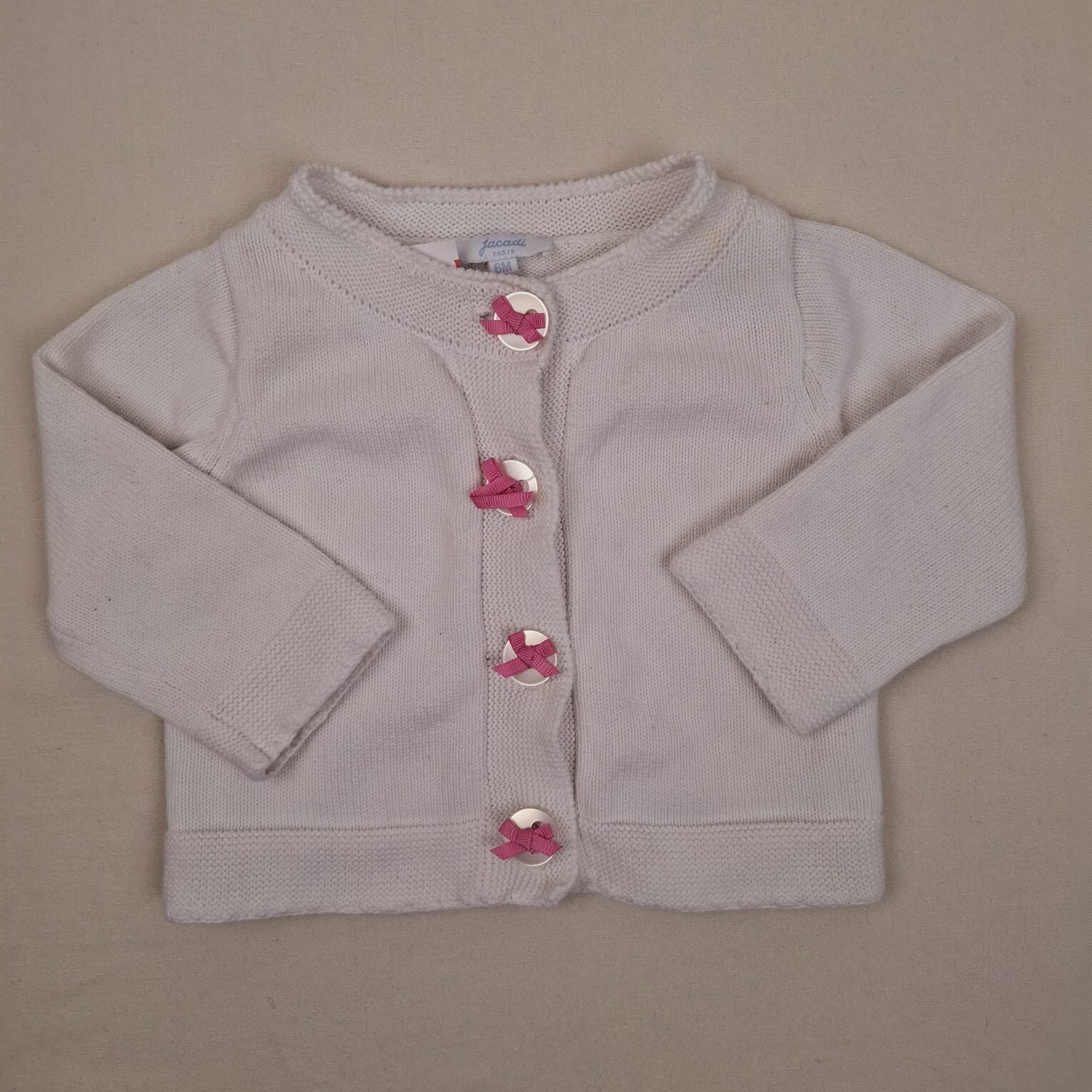 Autres commentaires : Gilet blanc en maille, fermeture par boutons avec petits noeuds roses, col rond, bordures côtelées.