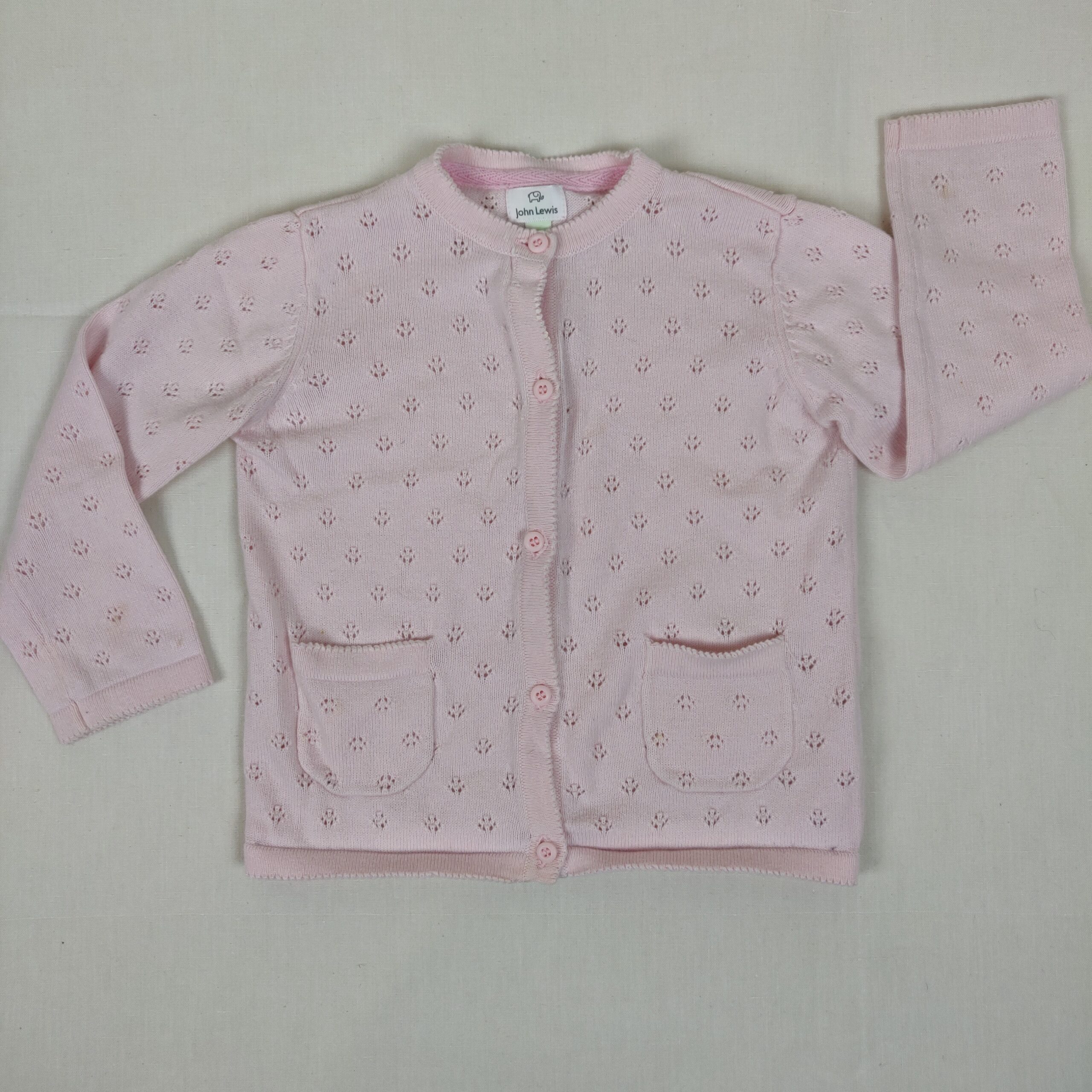 Autres commentaires : Cardigan rose fermé par 5 boutons, à motifs ajourés.
