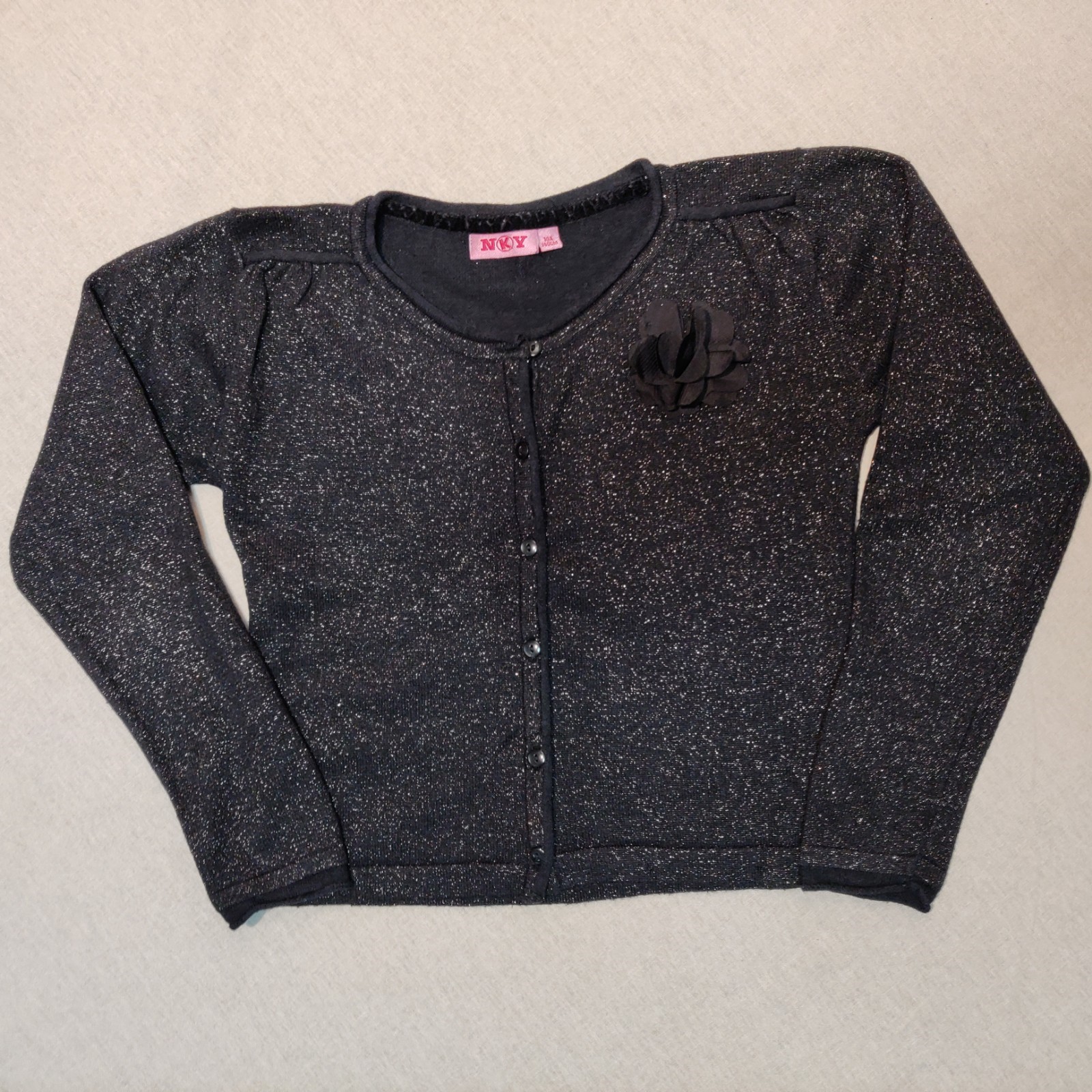 Autres commentaires : Contient polyamide, viscose, polyester et 7% de fils métalliques. Gilet noir et doré, fleur brodée sur le coeur. Col rond. Fermeture par 6 boutons. Idéal pour occasion spéciale.