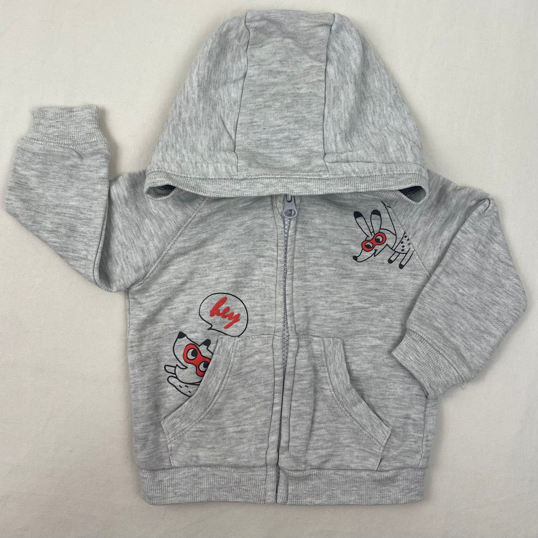 Autres commentaires : 1% viscose. Gilet gris avec capuche, fermeture à zip et motifs d’animaux masqués.