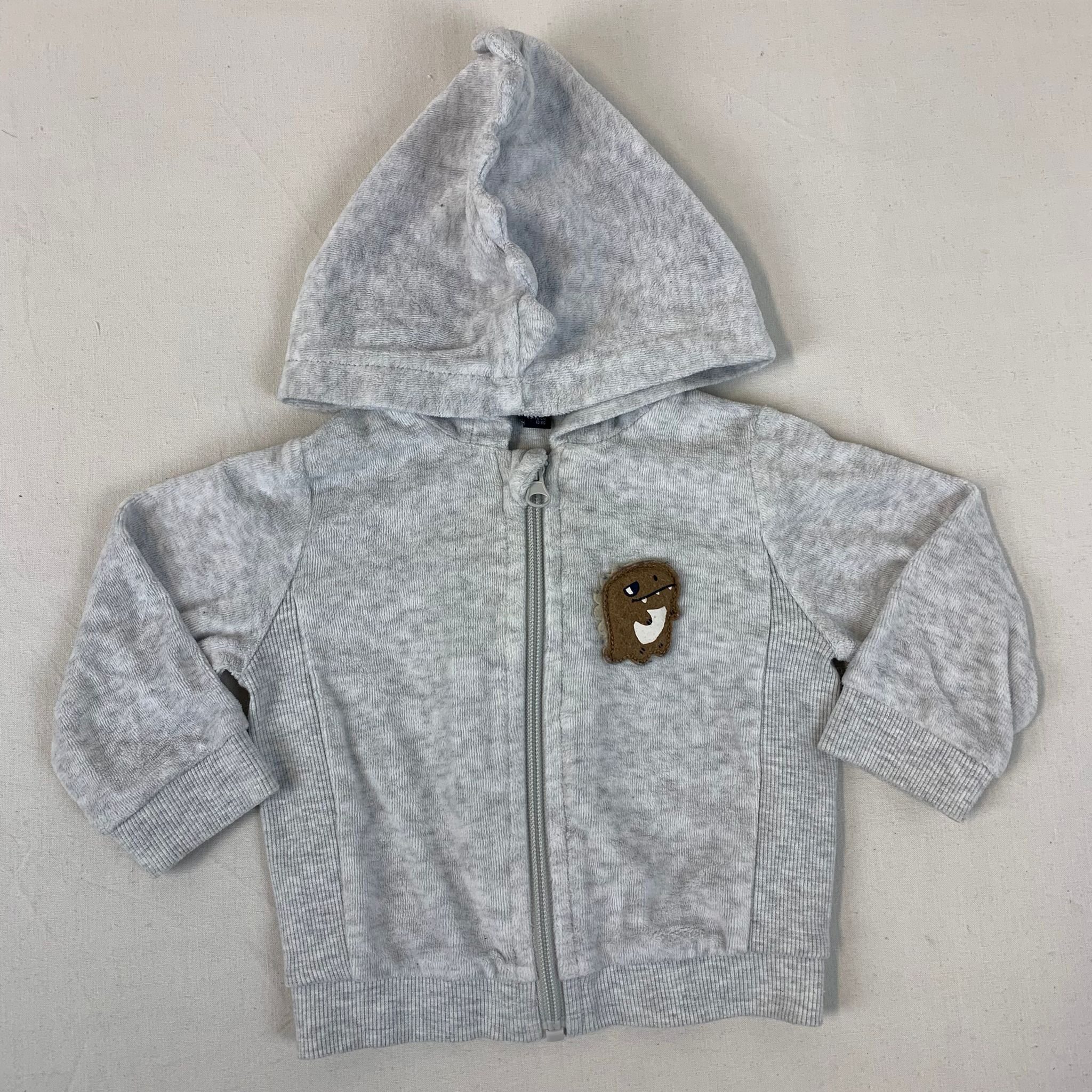 Autres commentaires : Gilet gris manches longues avec fermeture en zip et capuche. Contient 77% coton et 23% de polyester.