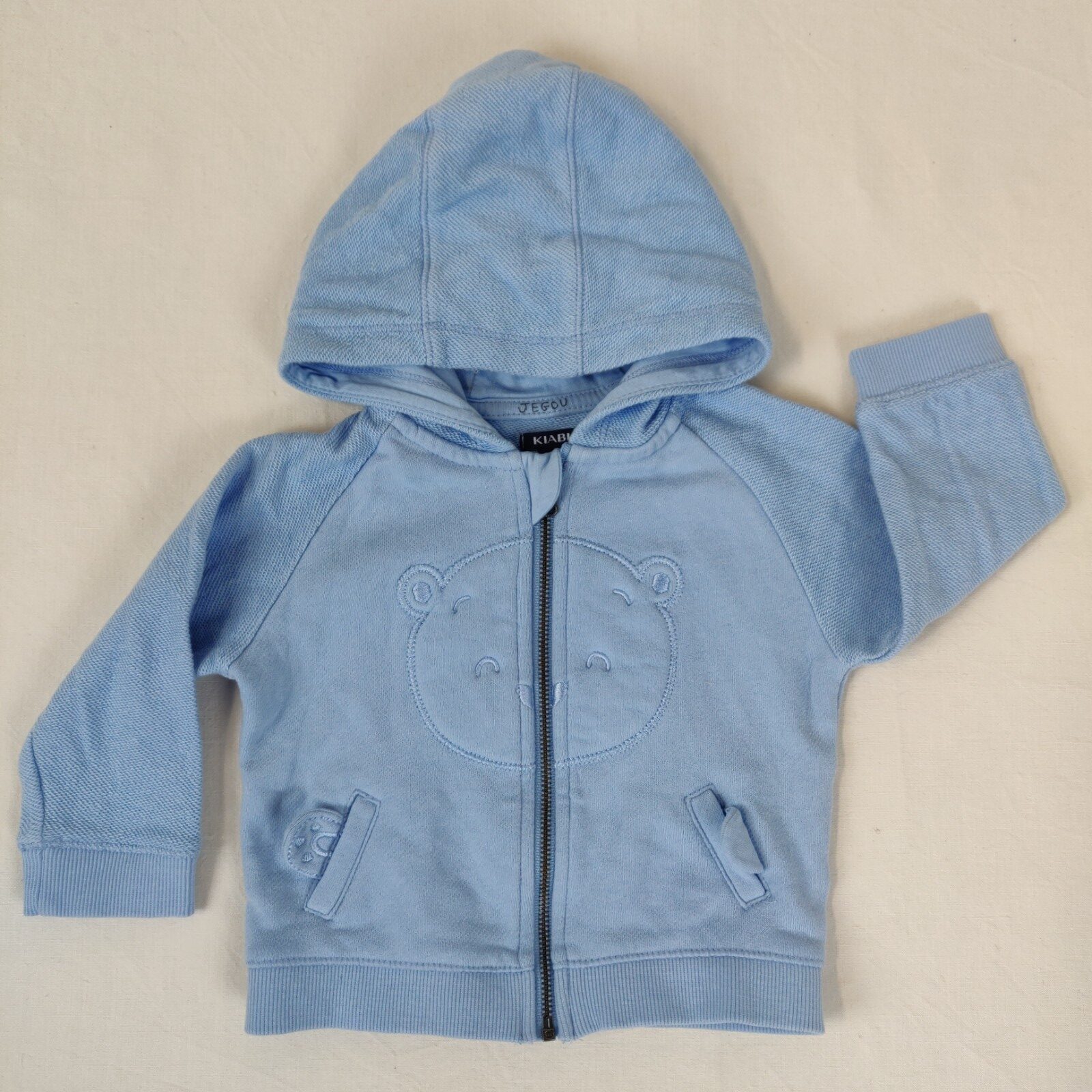 Autres commentaires : Gilet à capuche – bleu. Motif central visage d’ourson. 2 poches latérales ornées de pattes en relief. Ouverture centrale à zip métallique.