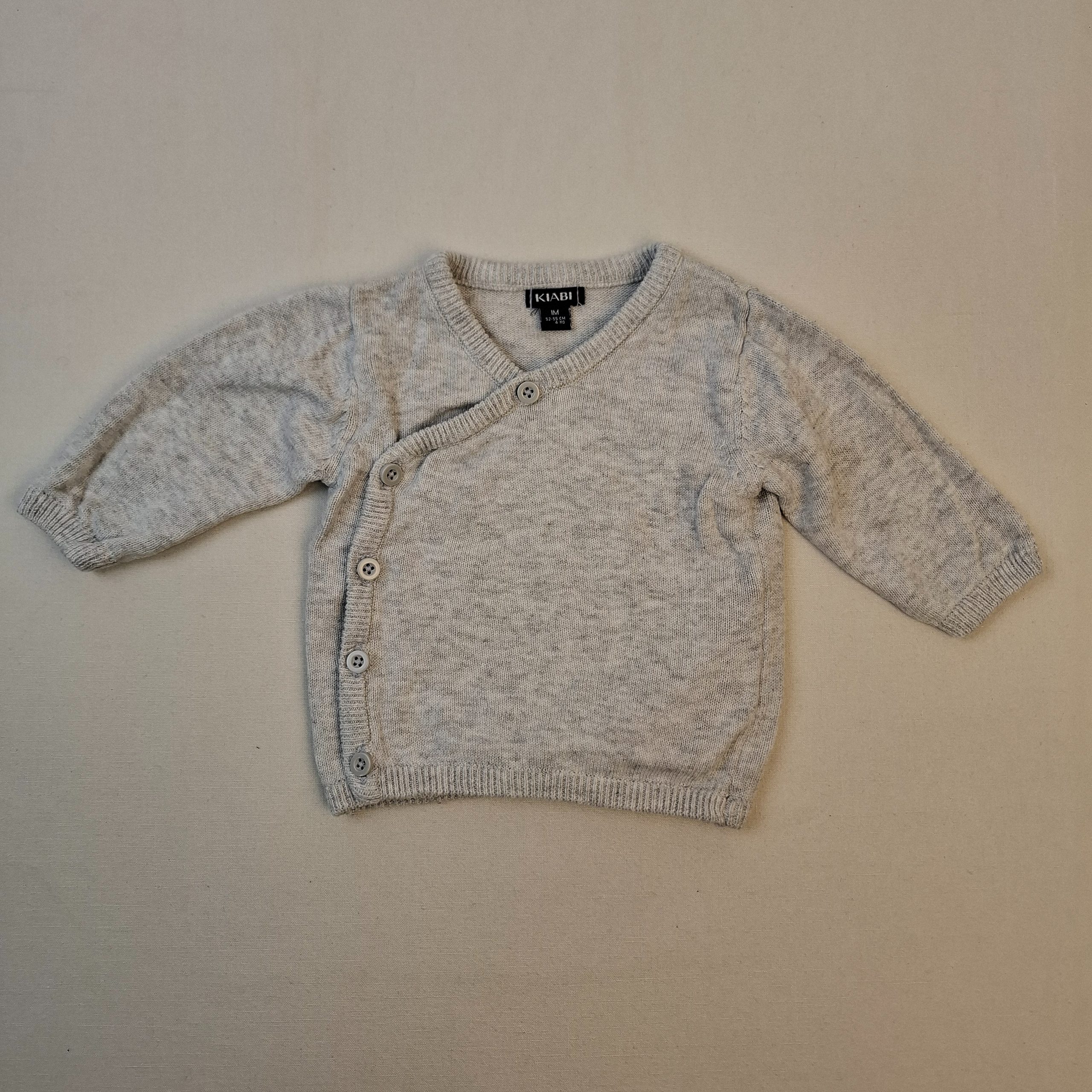 - Gilet en maille fine grise avec une fermeture croisée sur le devant par des boutons classiques.