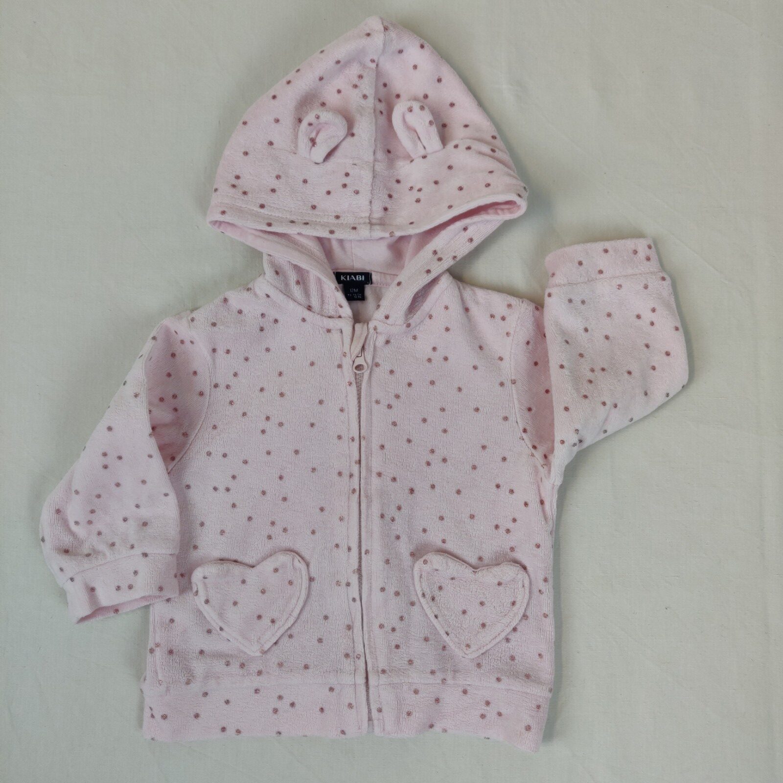 Autres commentaires : Gilet à capuche en velours rose clair. Motifs à pois roses pailletés. 2 poches centrales en forme de coeur. Ouverture centrale zippée.