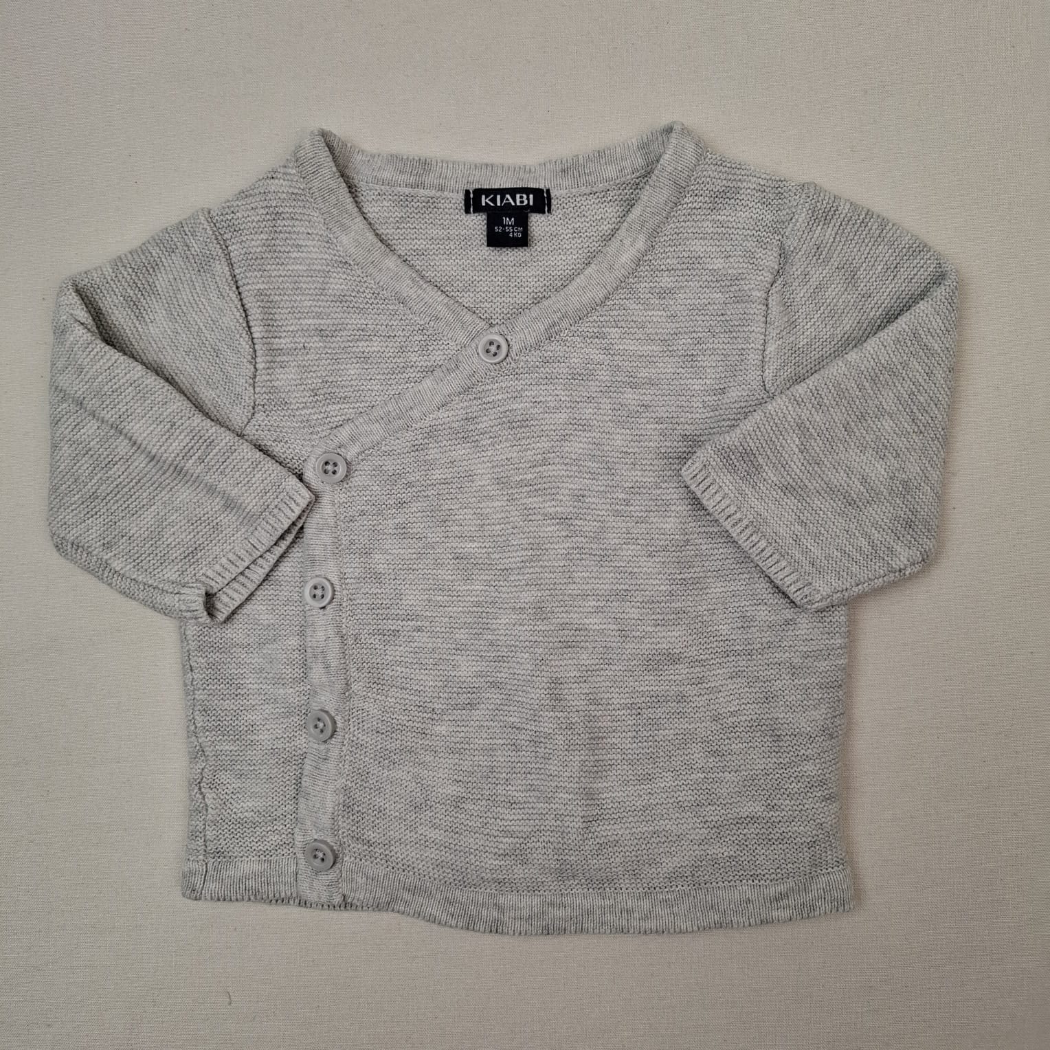 Autres commentaires : Gilet en maille asymétrique gris à manches longues, fermeture par boutons devant, col col croisé.