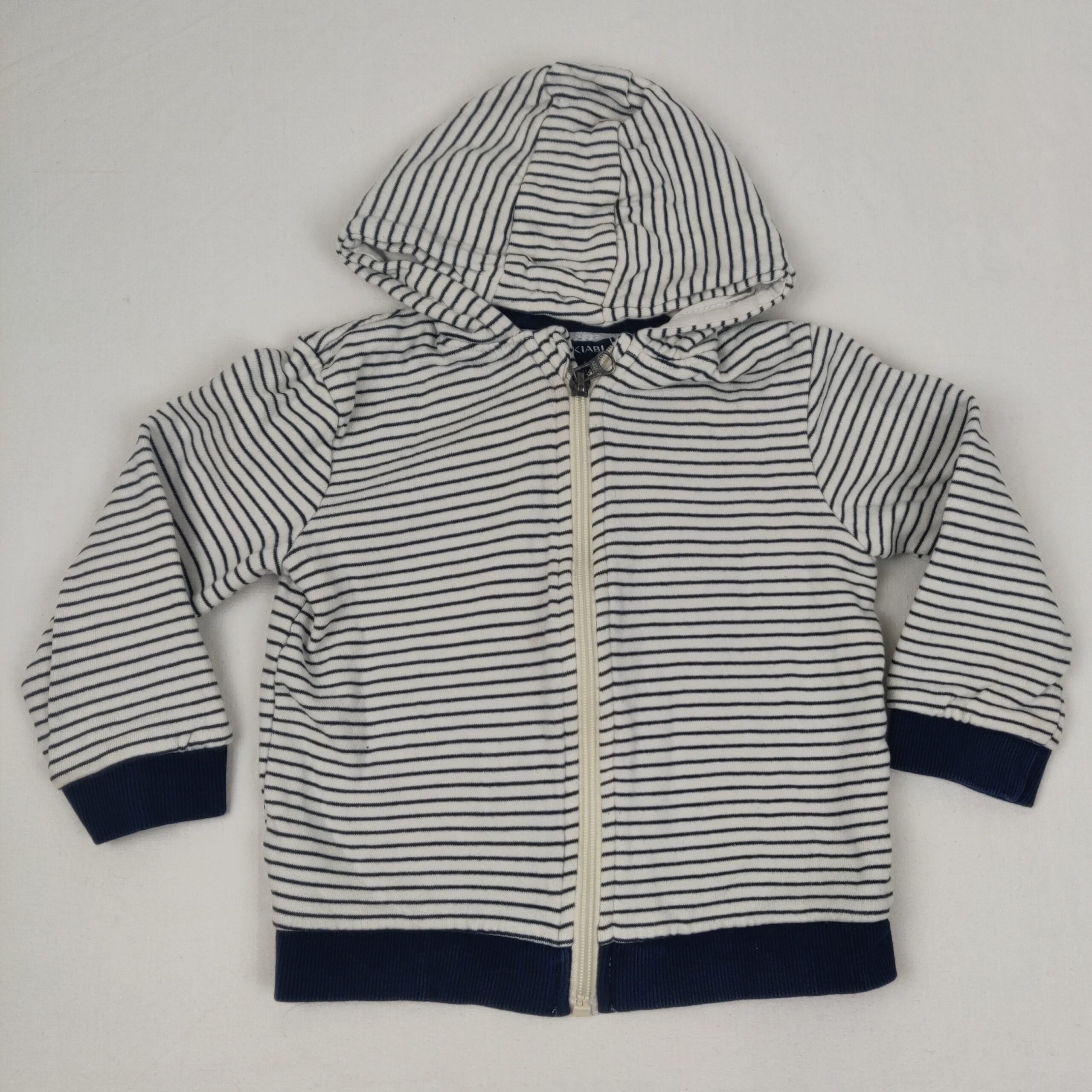 Autres commentaires : Gilet sweat blanc rayé bleu foncé à capuche, bas et poignets bleu marine et elastiqués, fermeture par zip.