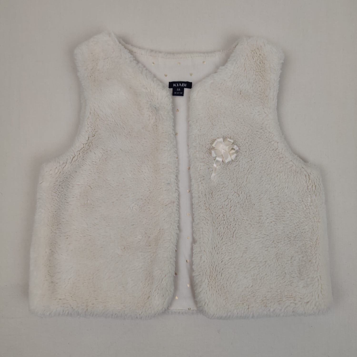 Autres commentaires : Gilet sans manches en fausse fourrure, écru, avec noeud en satin customisé sur le coeur. Peut se retirer.