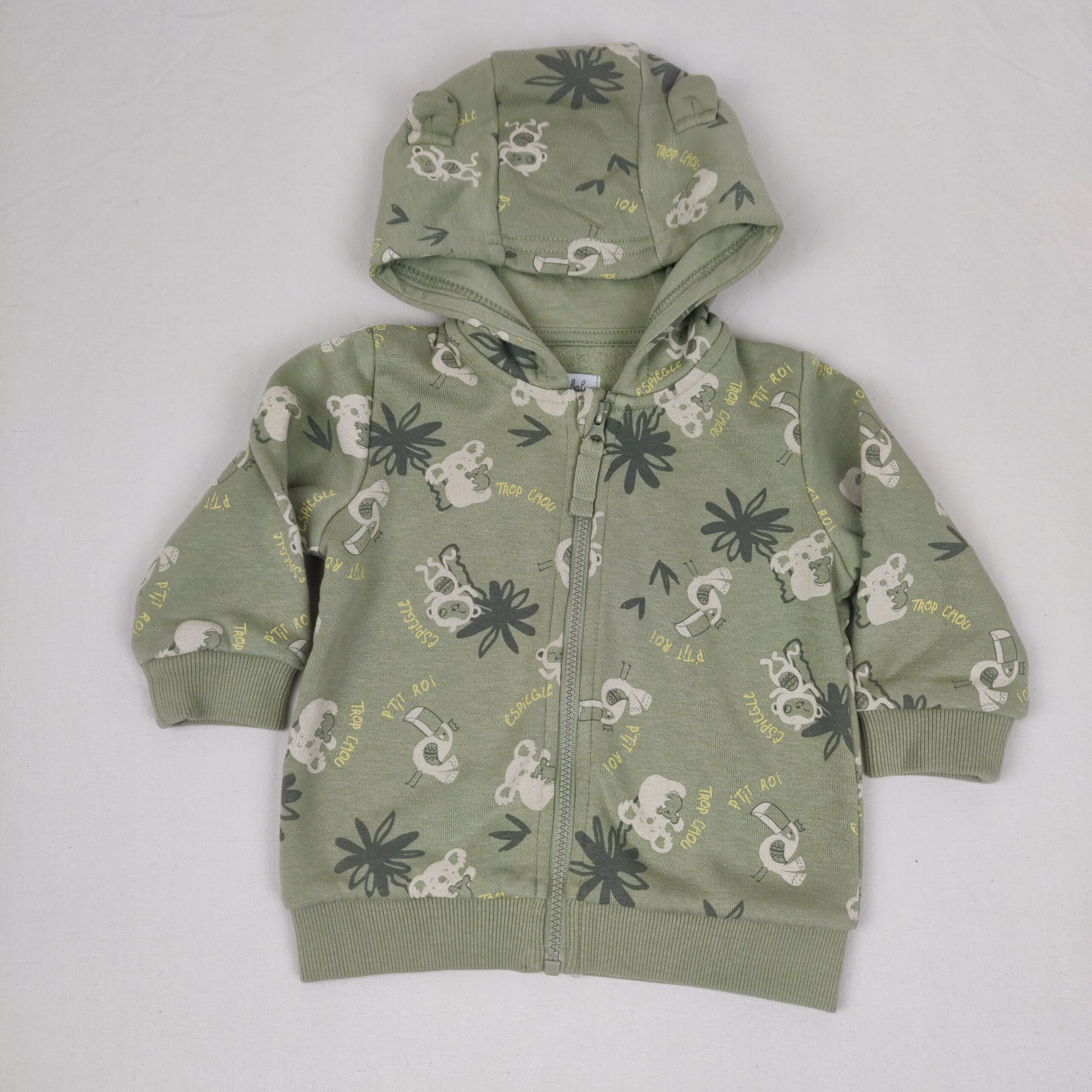 Autres commentaires : 40% polyester. Gilet à capuche, motif singes, perroquets, koalas.