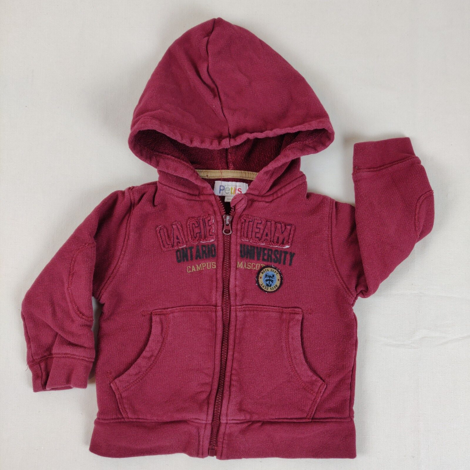 Autres commentaires : Gilet à capuche – bordeaux avec inscription centrale « La cie team Ontario university Campus mascot » accompagnée d’un écusson représentant un raton laveur. Ouverture centrale à zip. 2 poches latérales. Effet coudes rapiècés. Usure normale du vêtement.