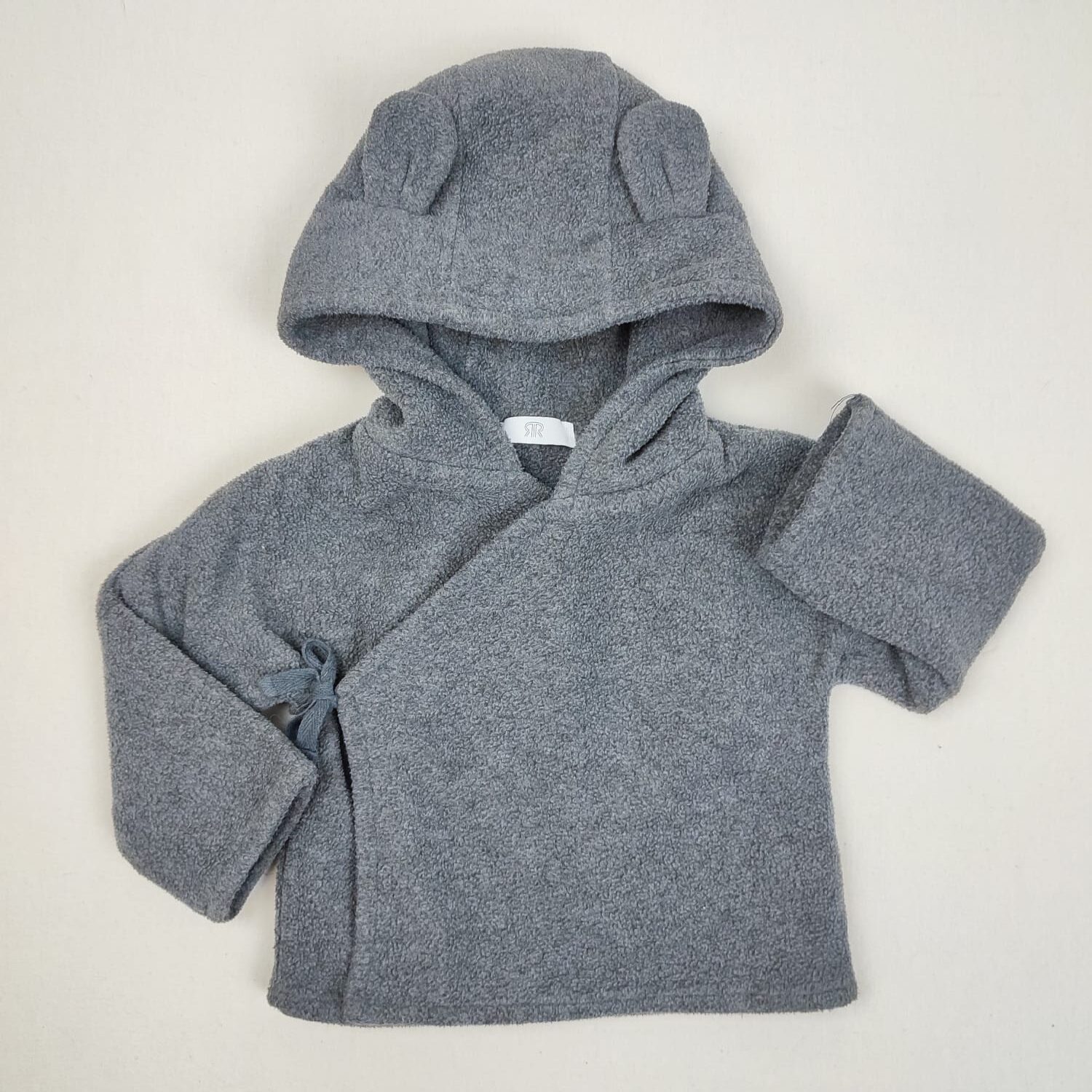Autres commentaires : Gilet polaire gris foncé à capuche avec oreilles d’ours, croisé avec liens.