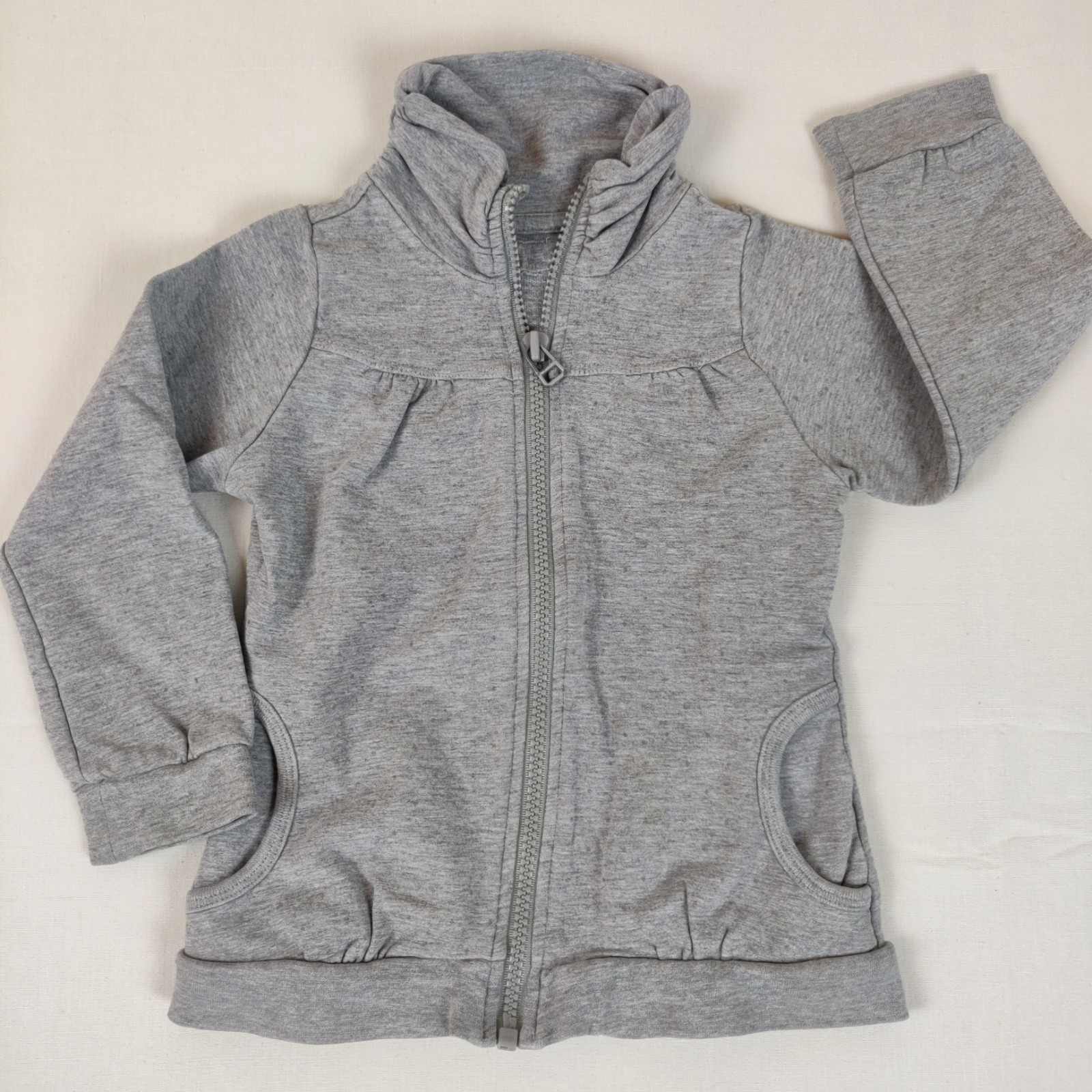 Autres commentaires : 11% viscose, 5% élasthanne. Gilet – gris clair chiné avec col montant. Ouverture centrale à fermeture éclair. 2 poches latérales.