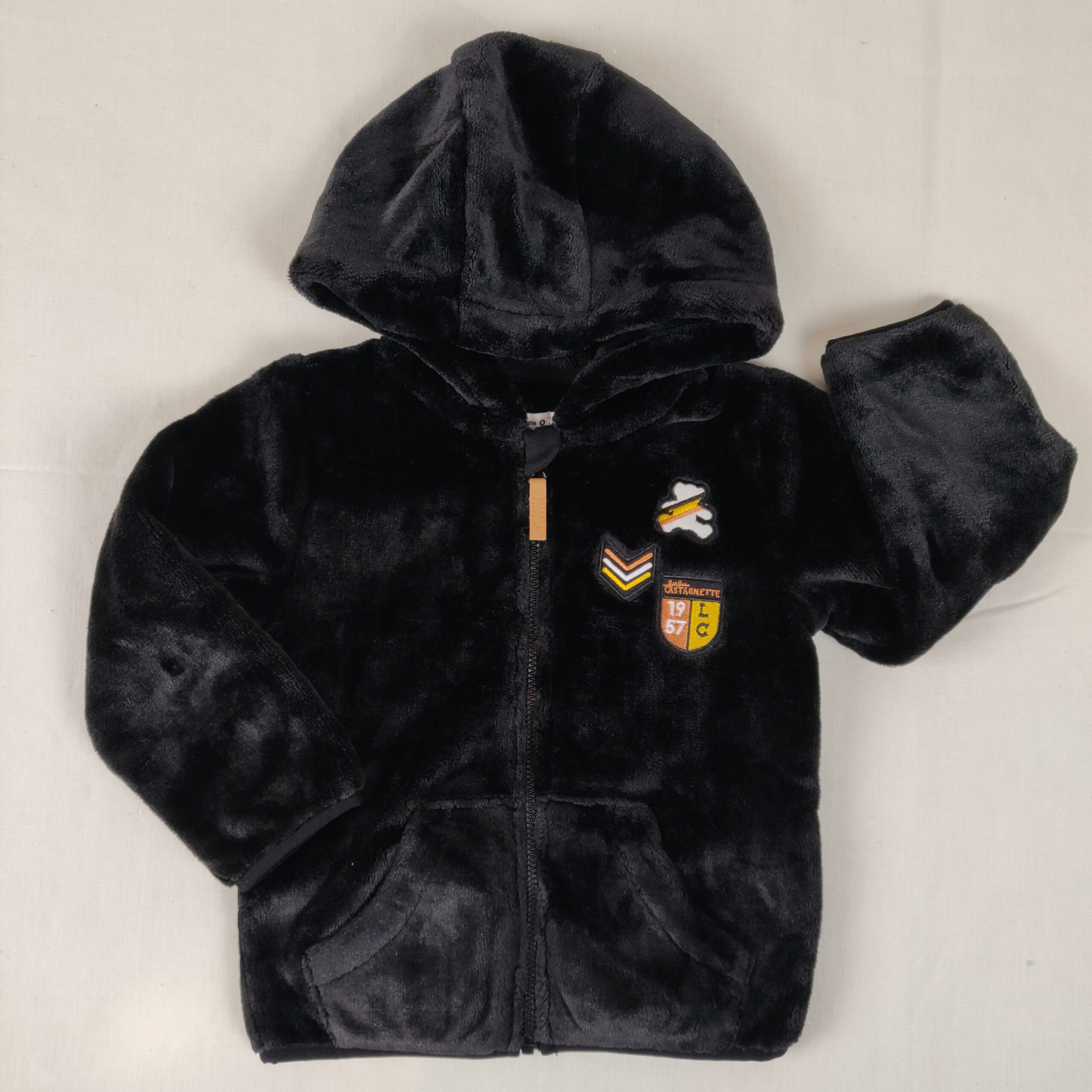 Autres commentaires : Gilet à capuche en polaire – noir. Fermeture éclair centrale. Trois écussons centraux. 2 poches latérales. Taille et poignets élastiques.