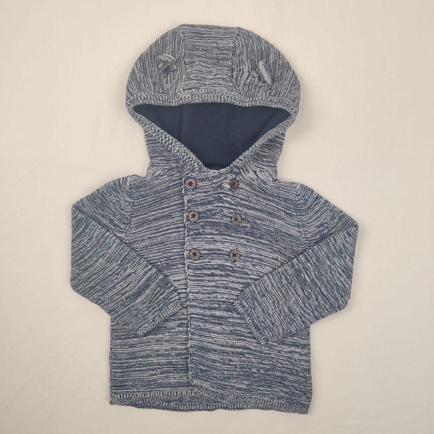 Autres commentaires : Gilet à capuche manches longues en maille striée de blanc et bleu marine, capuche avec doublure en coton bleu marine, fermeture en haut devant par double boutonnière.