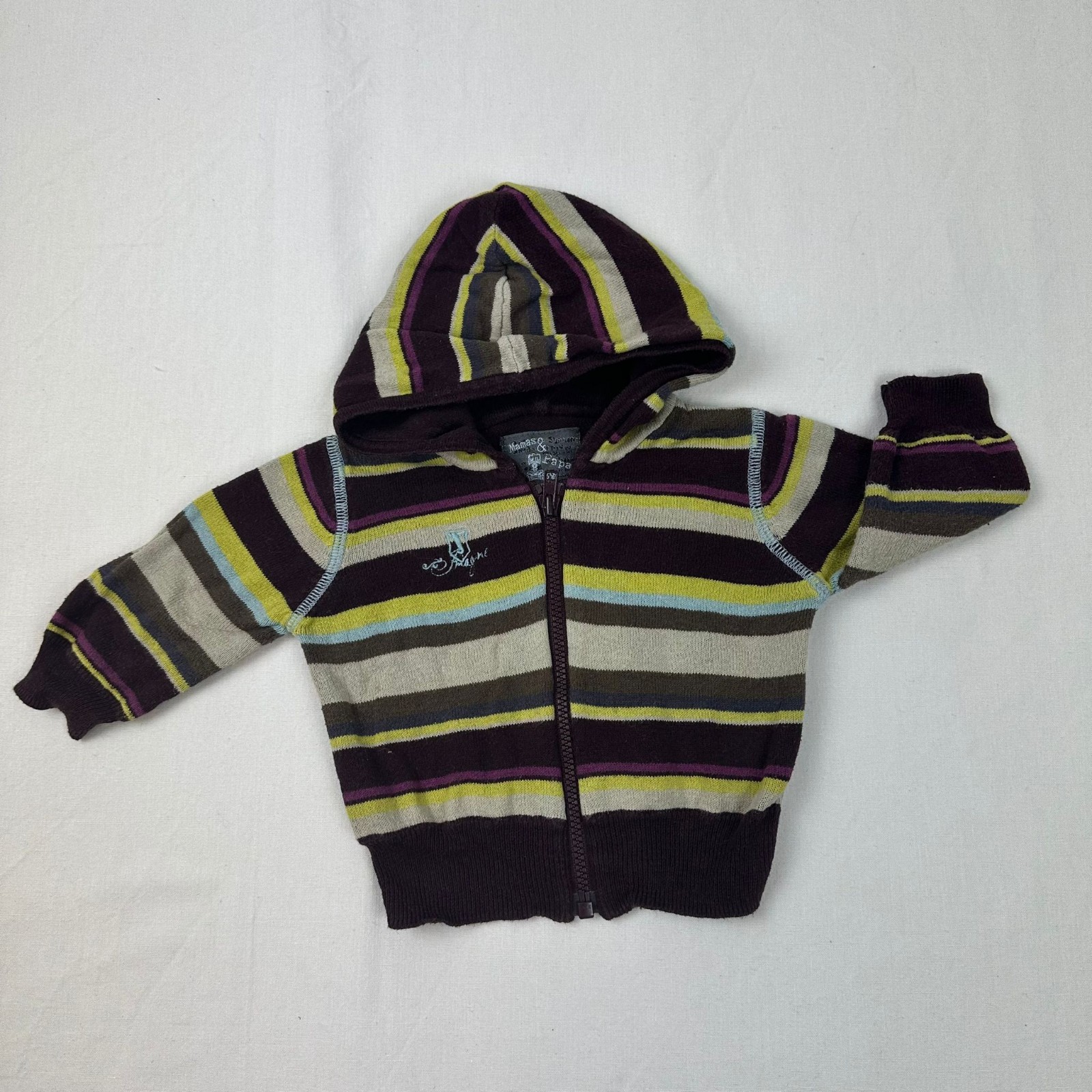 Autres commentaires : Gilet à rayures multicolores bordeaux, jaune, bleu, marron, beige, violet et blanc manches longues avec capuche et une fermeture en zip.