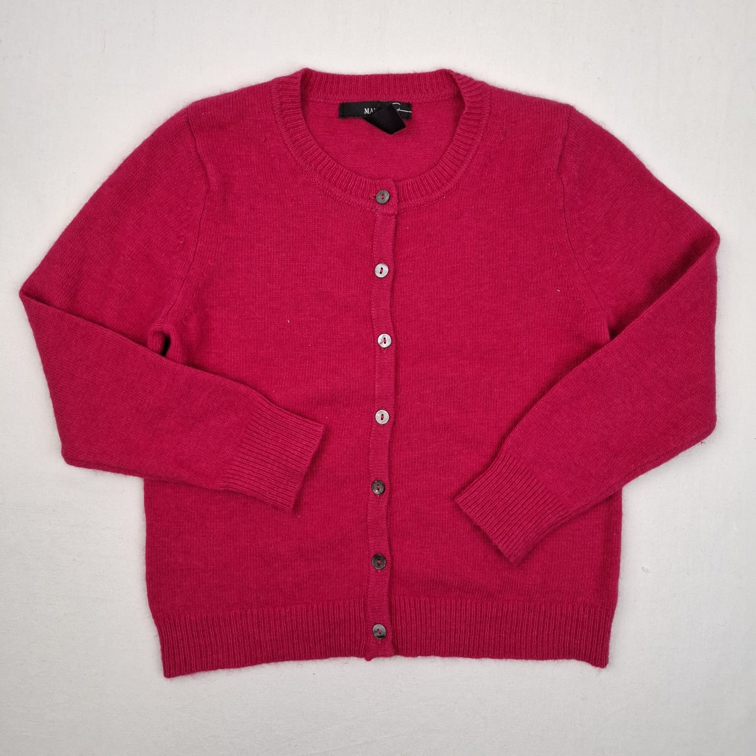 Autres commentaires : 19% angora, 14% laine. Gilet fuchsia tricoté, fermeture par boutons, finition bords-côtes, col rond, taille S.
