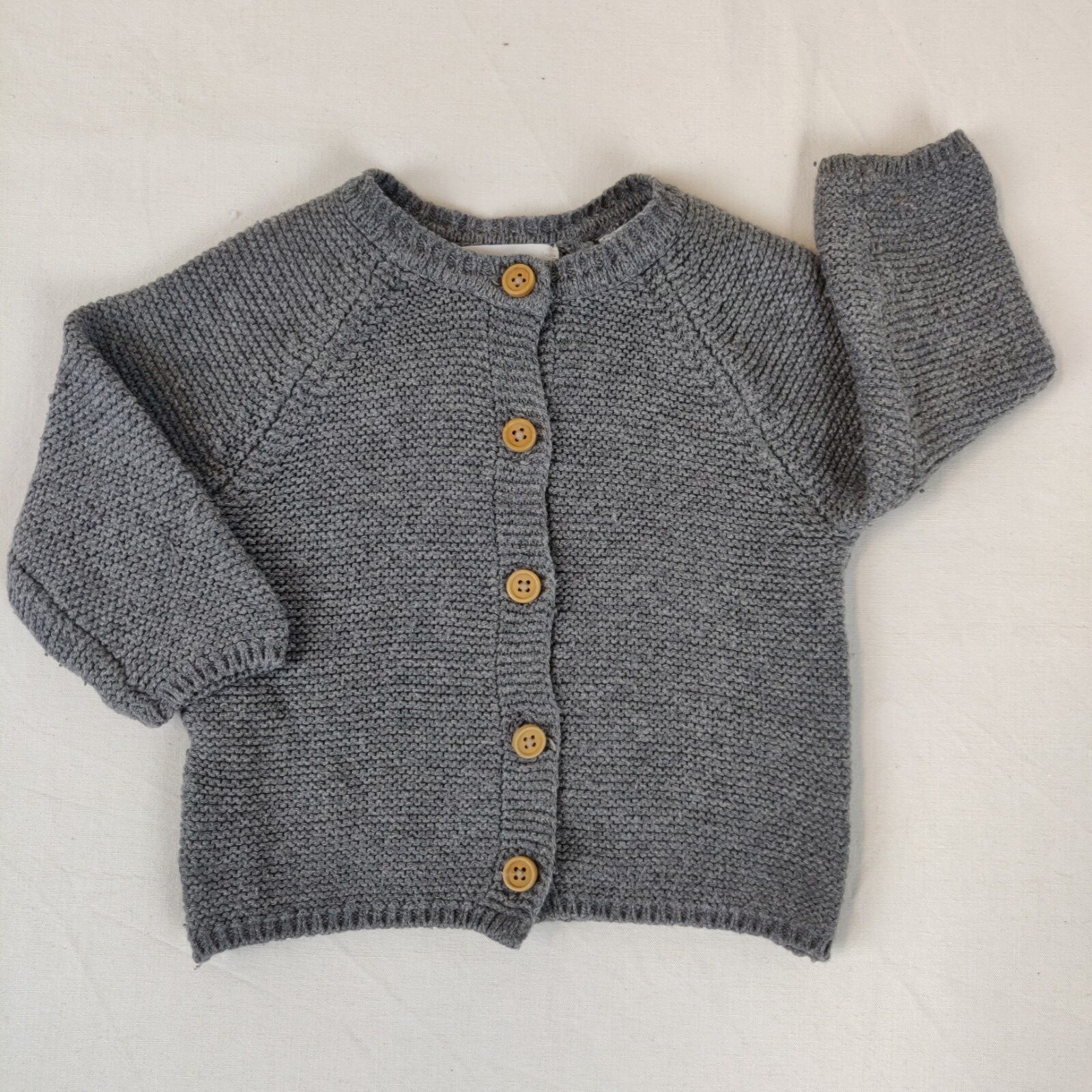 Autres commentaires : Gilet en maille (contient probablement du polyester, car chaud au toucher), col rond, fermé par boutons.