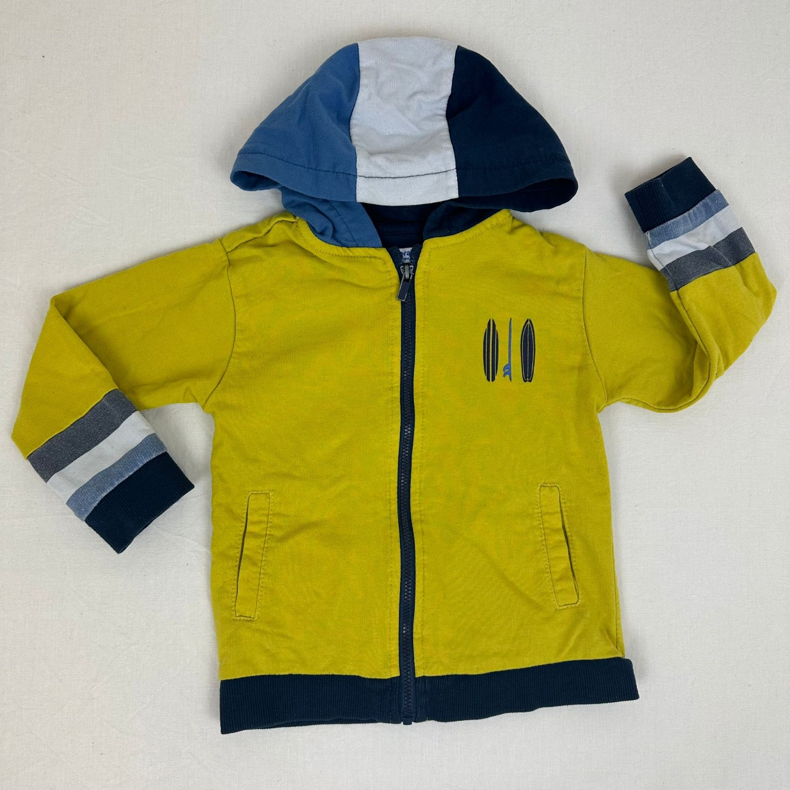 Autres commentaires : 39% polyester et 1% elasthanne. Gilet jaune manches longues avec capuche et une fermeture en zip.