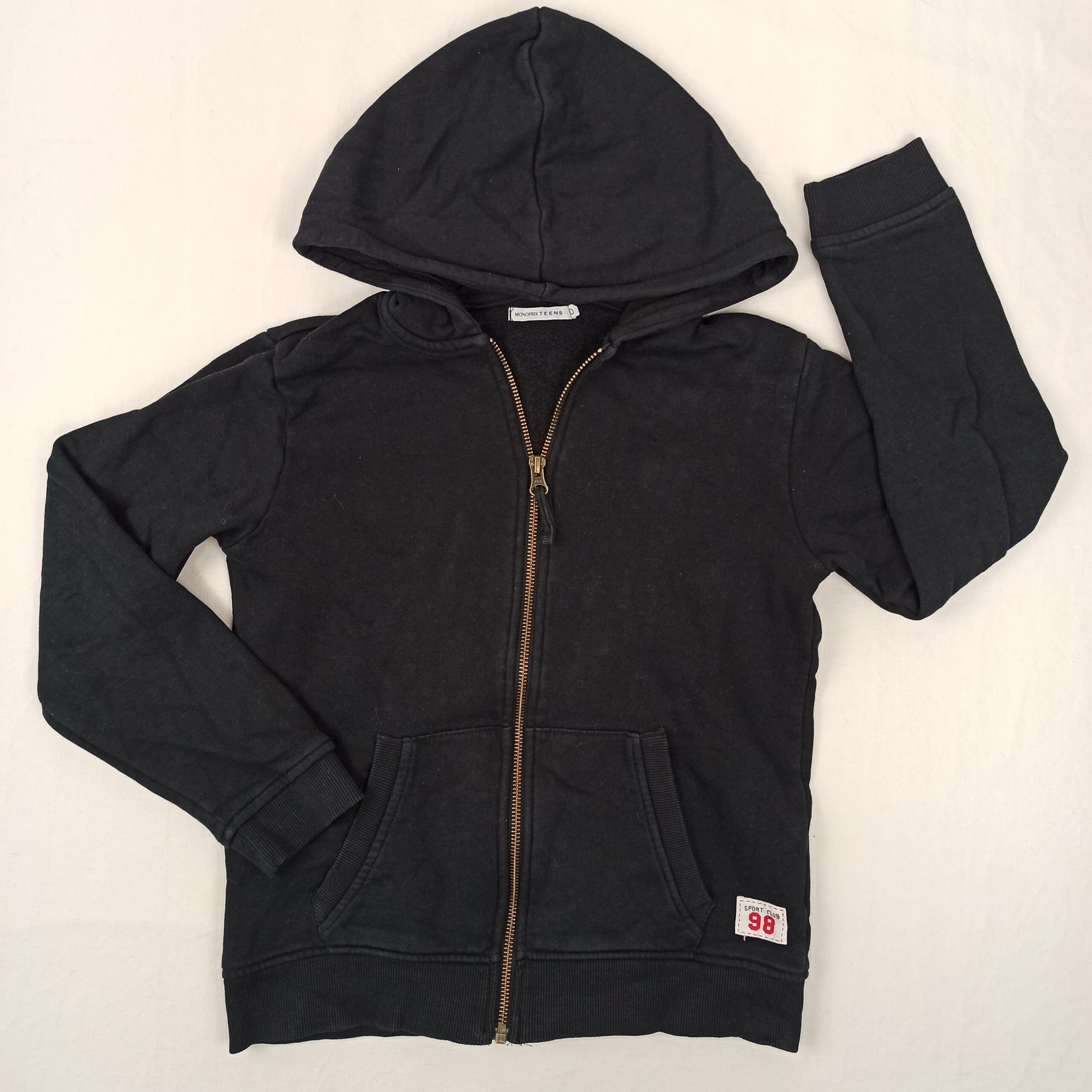 Autres commentaires : Gilet zippé uni noir à capuche. Gamme bio.