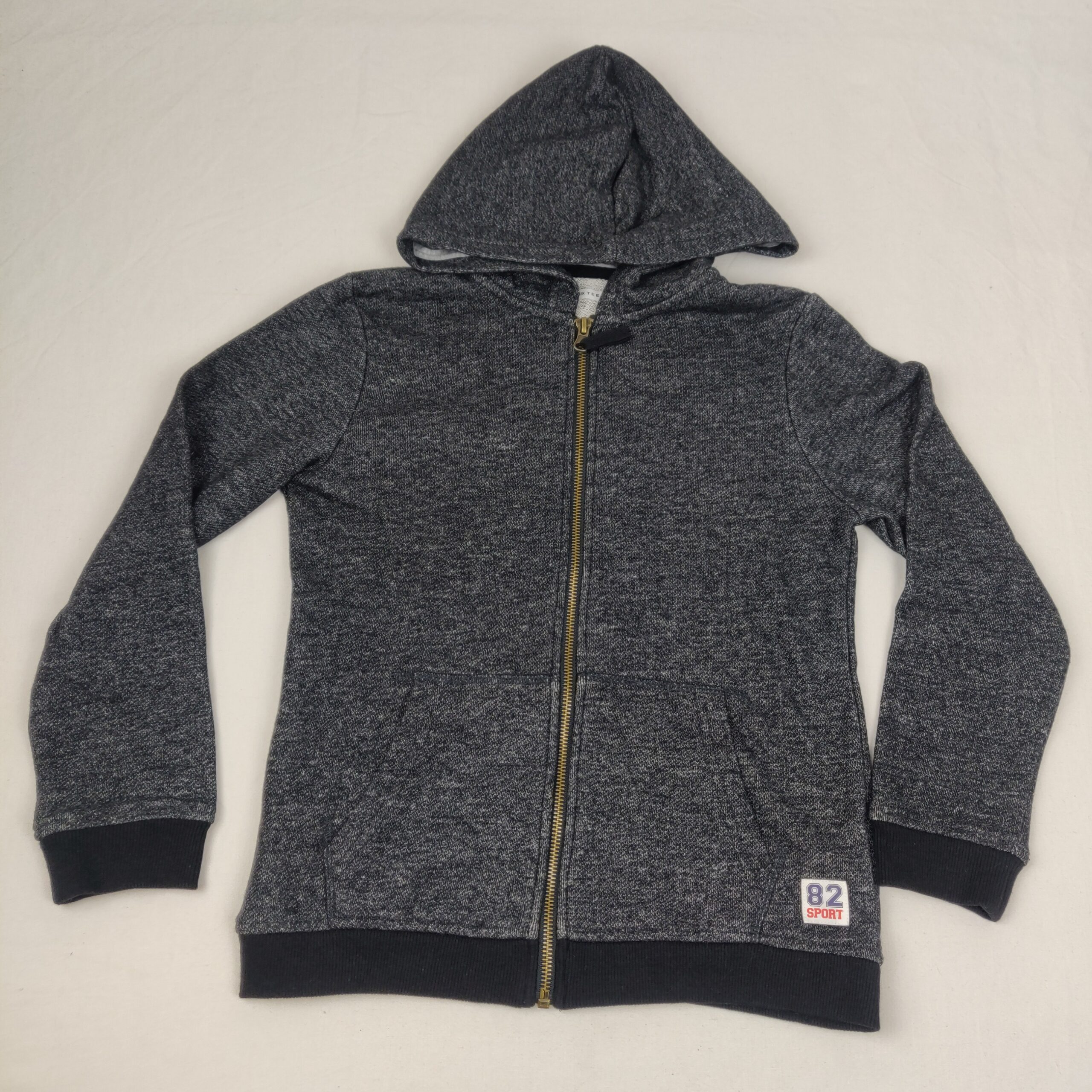 Autres commentaires : 28% polyester – Gilet sweat noir chiné, zippé à capuche doublée tissu gris clair 100% coton, bords cotes 99% coton et 1% élasthanne, poches ventrales.