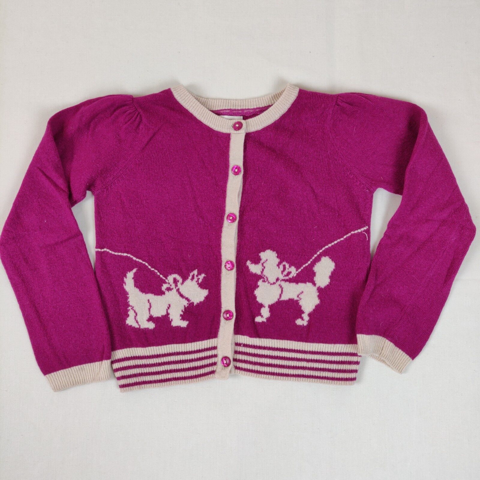 Autres commentaires : 31% viscose, 21% nylon, 7% angora. Pull (taille estimée 4 ans) en fines mailles – rose fuchsia avec motifs blancs latéraux chiens. Ouverture centrale à boutons classiques nacrés.