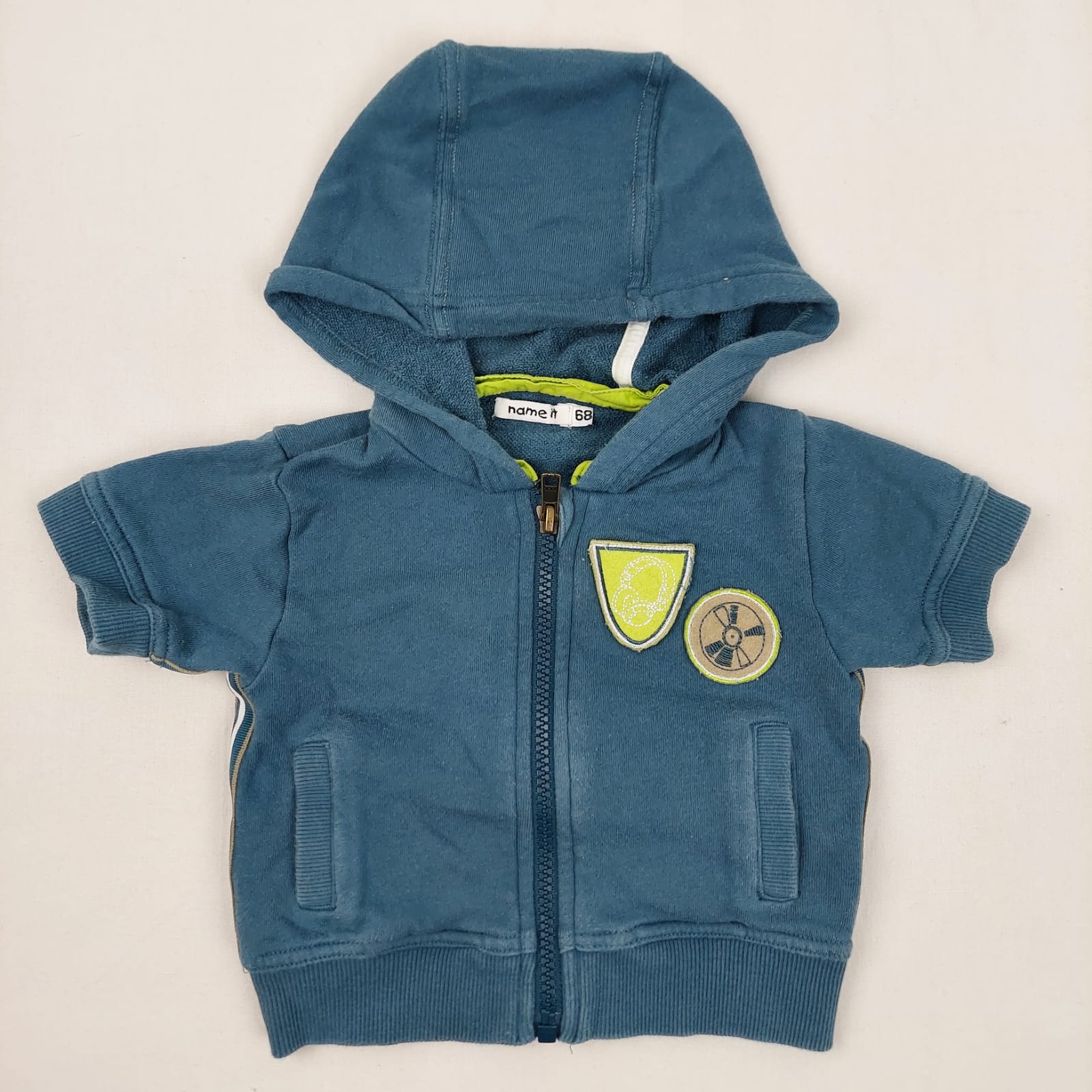 Autres commentaires : Gilet manches courtes zip à capuche bleu, patch, poches avant