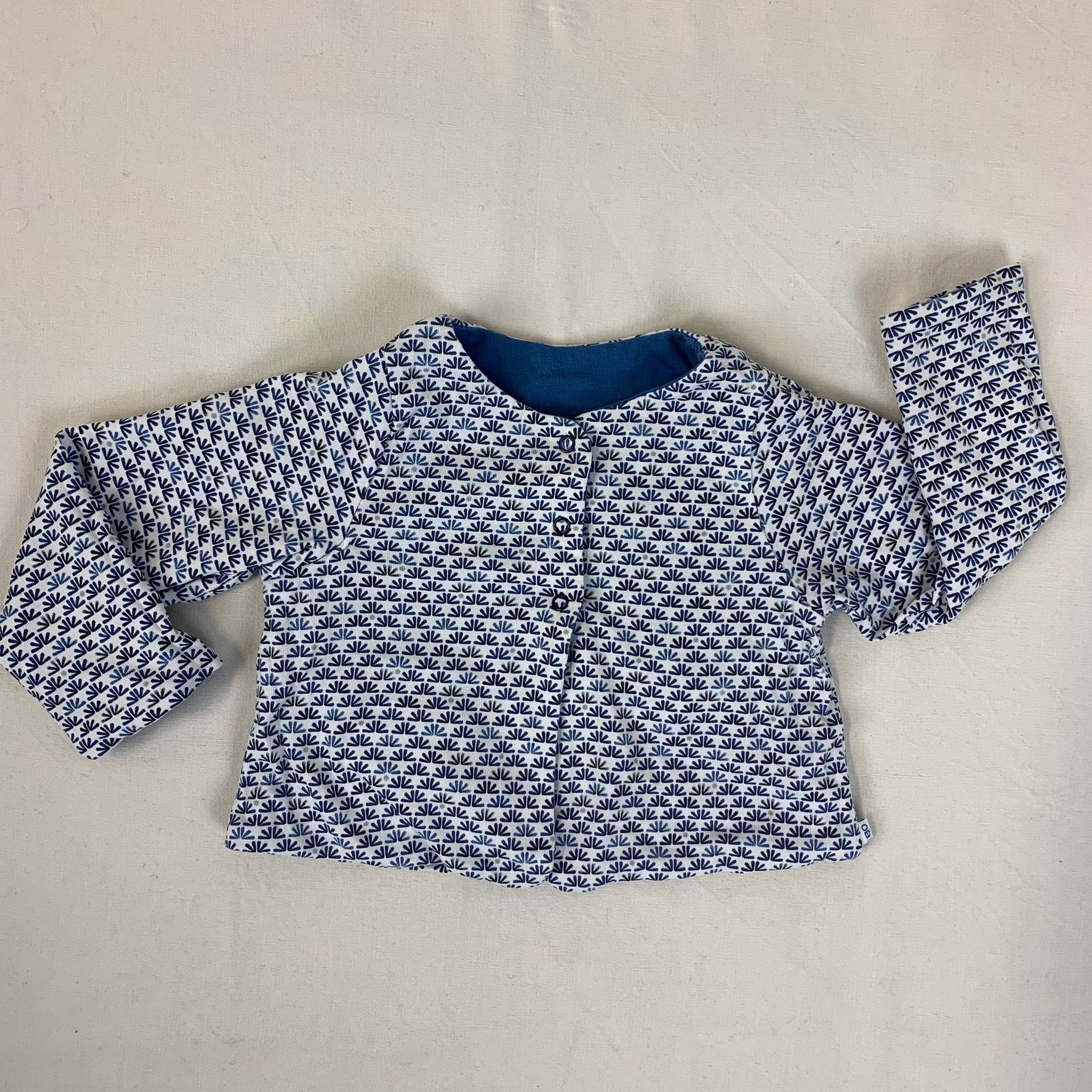 Autres commentaires : Gilet bleu manches longues reversible avec une fermeture par 3 boutons pressions.