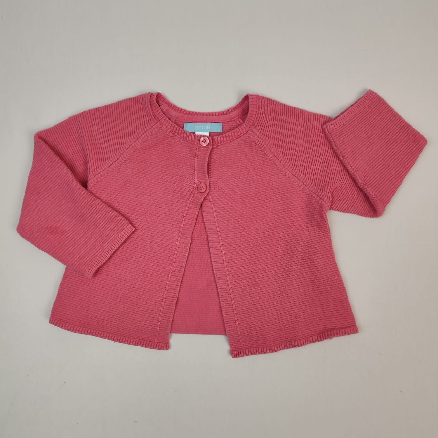 Autres commentaires : 22% polyamide. Gilet en maille rose, col rond, fermeture par deux boutons en haut devant.