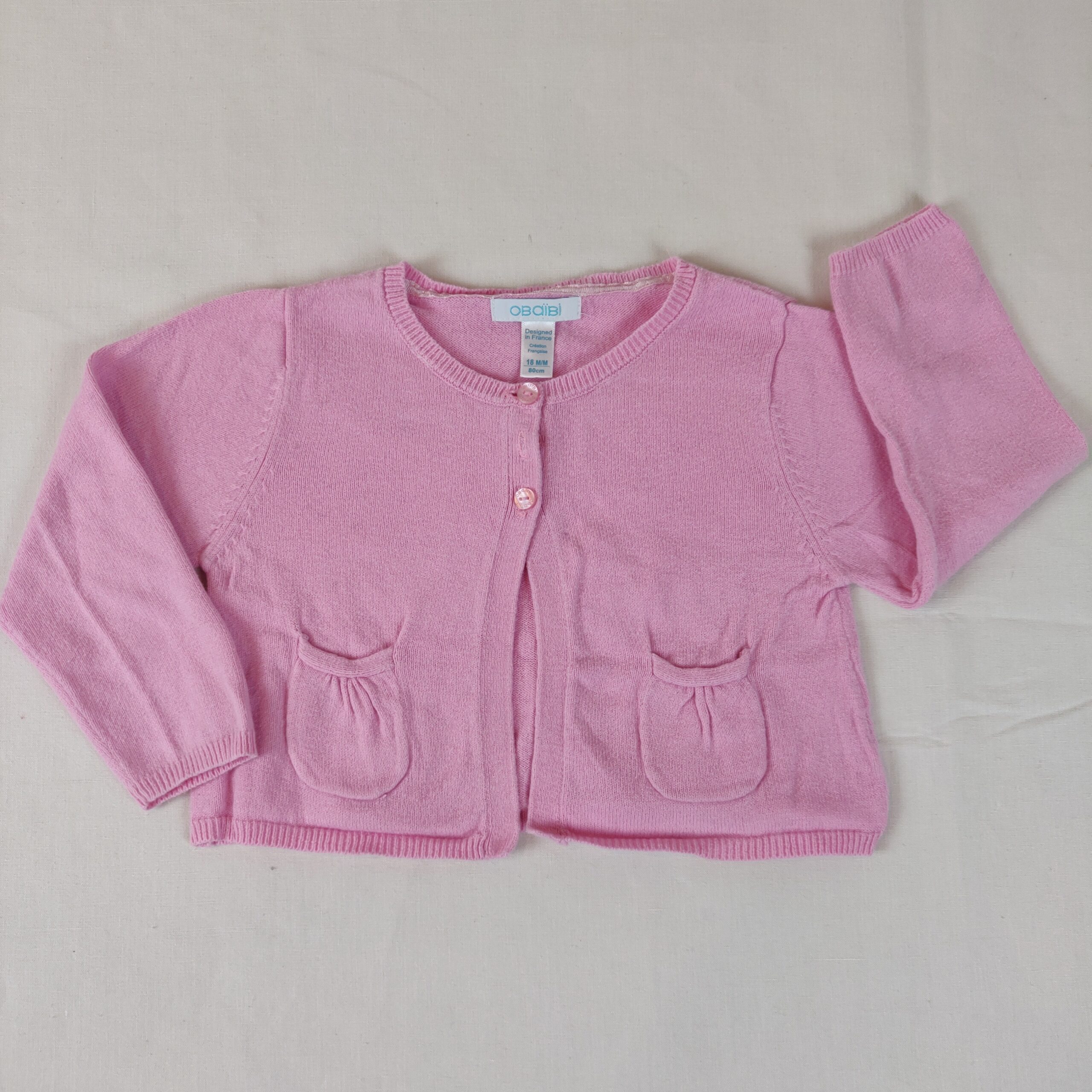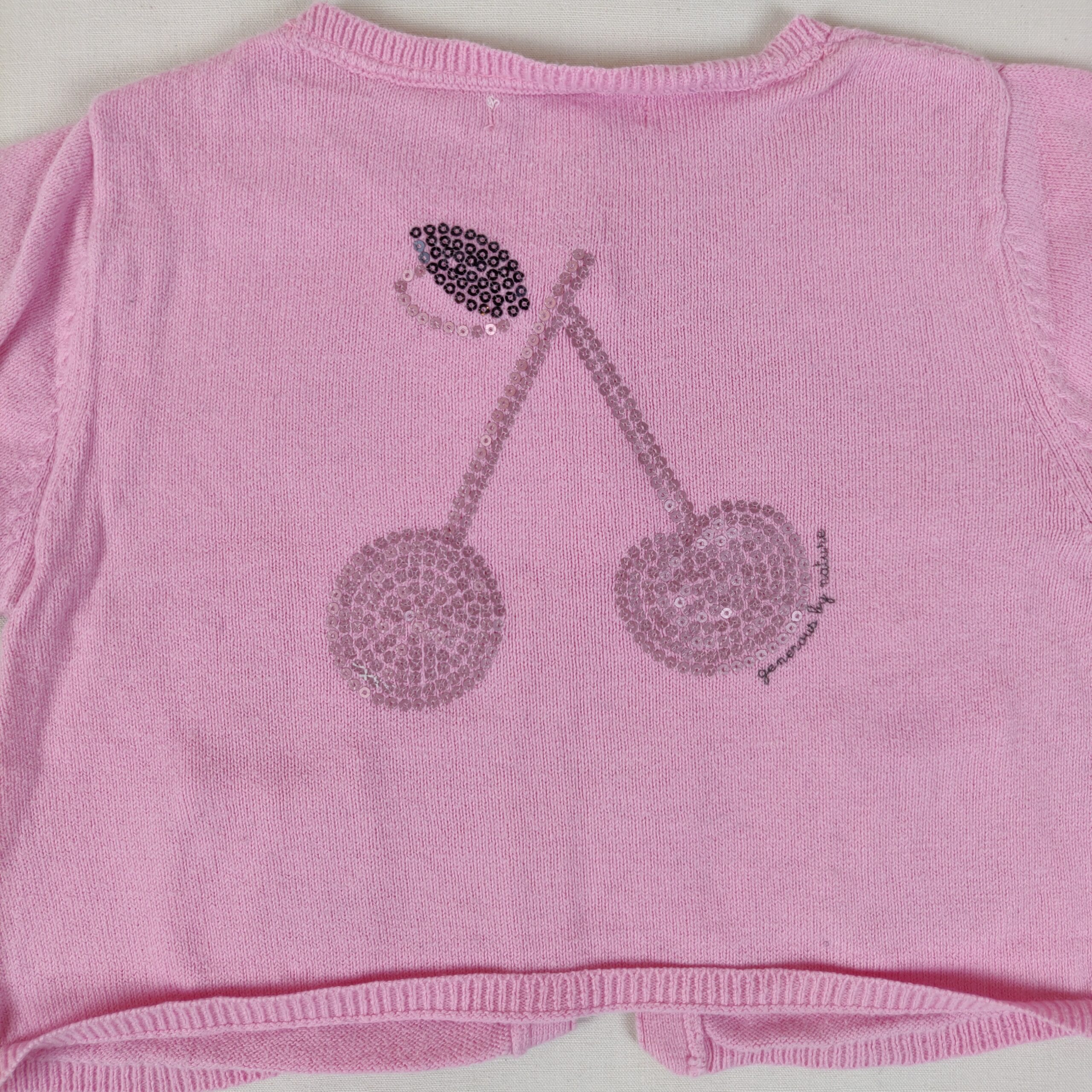 Autres commentaires : Gilet – rose – à ouverture centrale à 2 boutons. 2 poches latérales. Cerise en sequins gris clair et noirs. Usure normale.