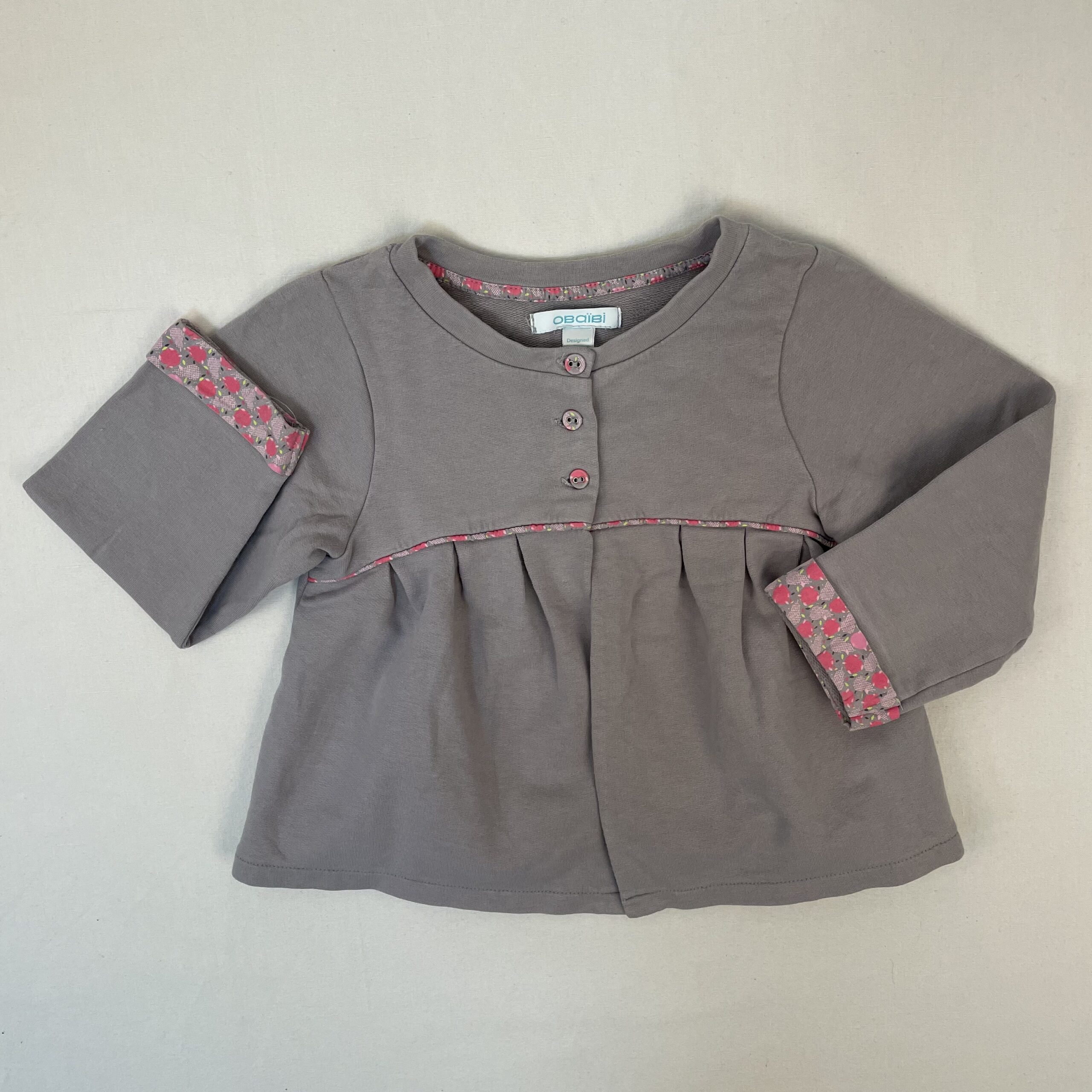- Gilet gris perle, plissé devant, liseré fleuri rose et mauve, fermeture devant par 3 petits boutons fleuris roses et mauves.