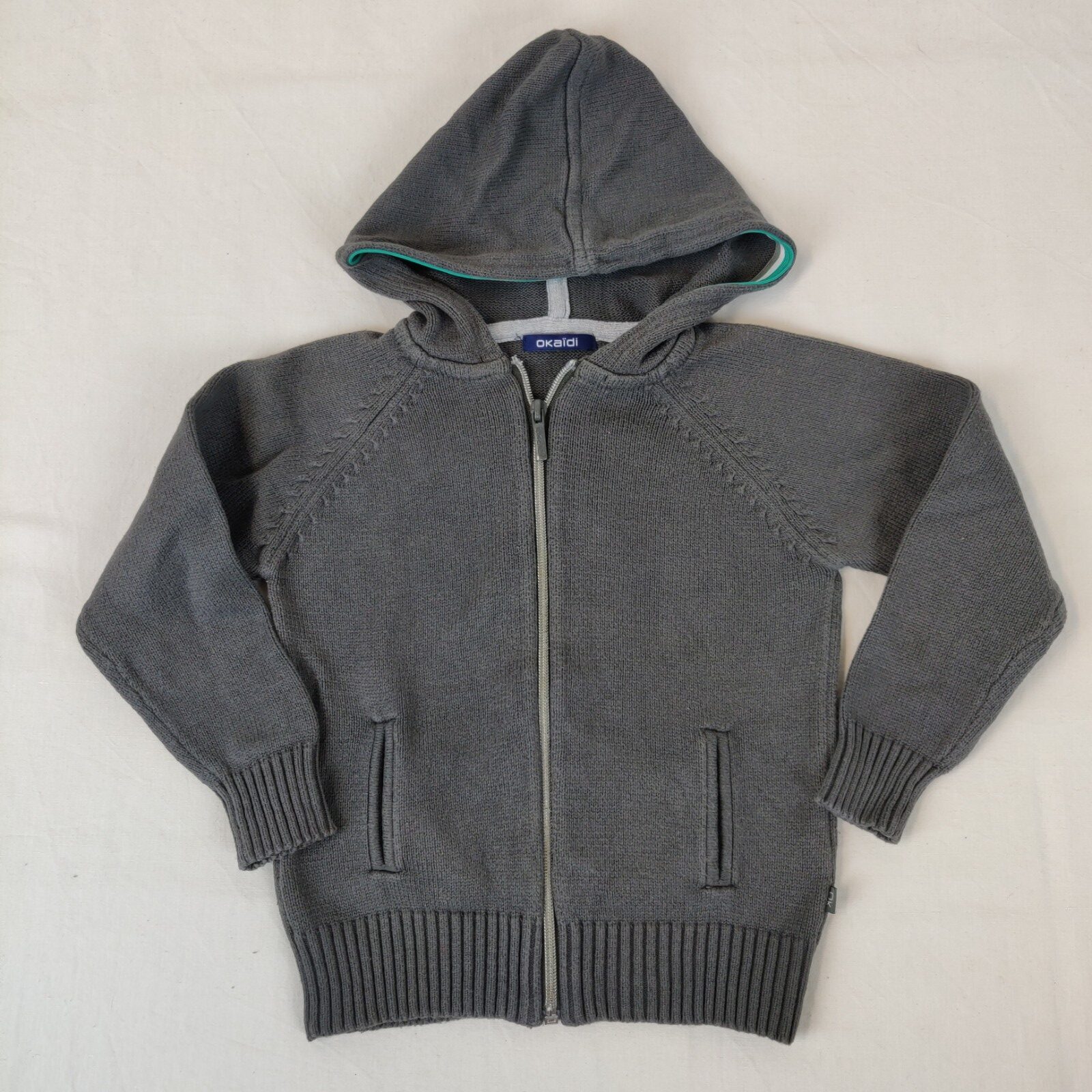 Autres commentaires : Gilet à capuche en fines mailles gris foncé. Ouverture centrale zippée. 2 poches latérales.