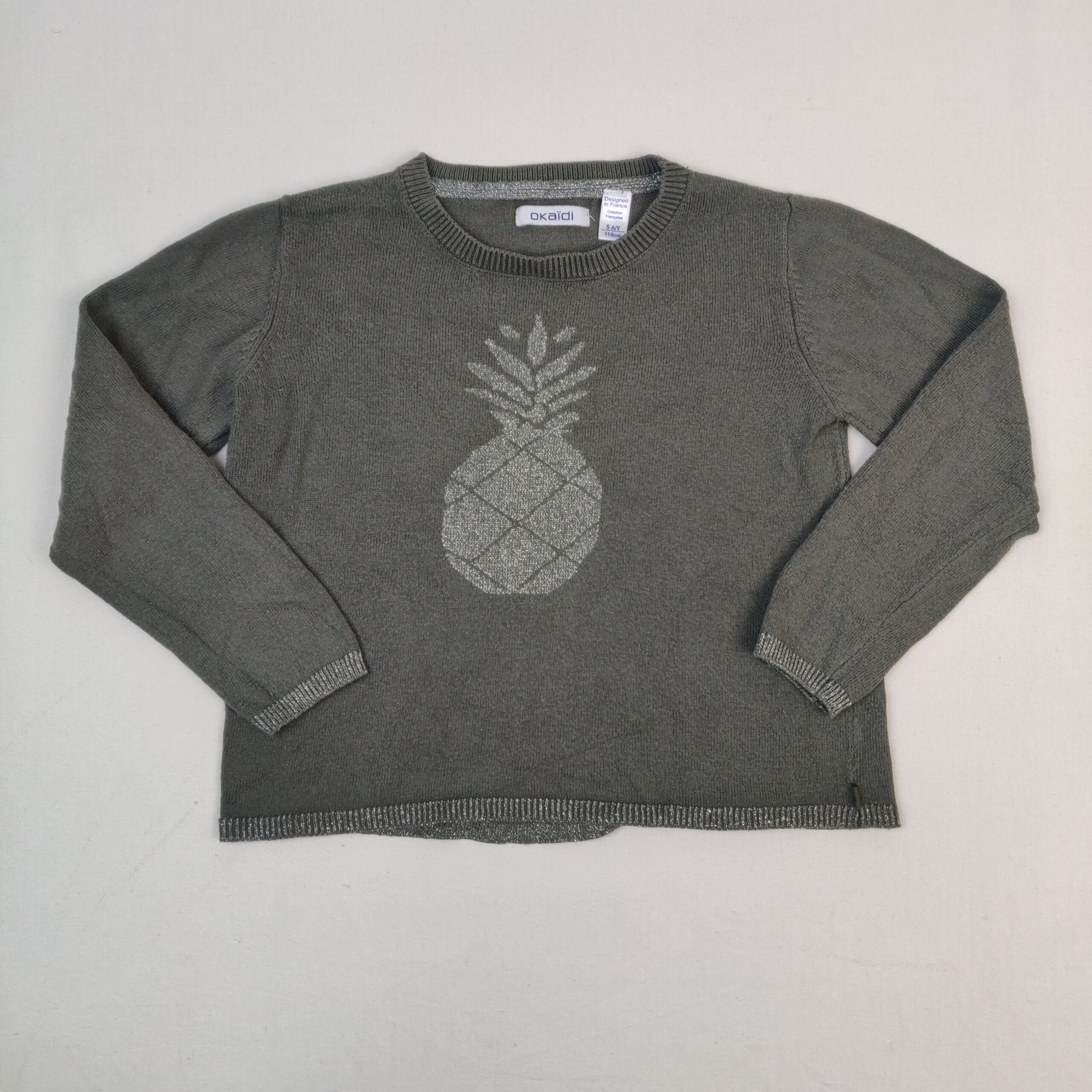 Autres commentaires : Pull fin en maille à manches longues vert kaki, col rond, motif ananas gris argenté sur le devant, très fines bouloches. Niveau réduit de Fraise à Myrtille.