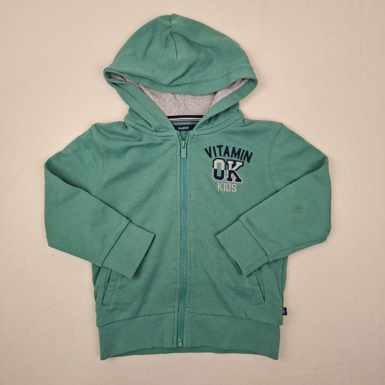 Autres commentaires : 30% polyester. GIlet sweat à capuche, fermeture devant par zip, devant inscriptions brodées « VITAMIN OK KIDS » en bleu et blanc, capuche doublée de tissu gris 100% coton.