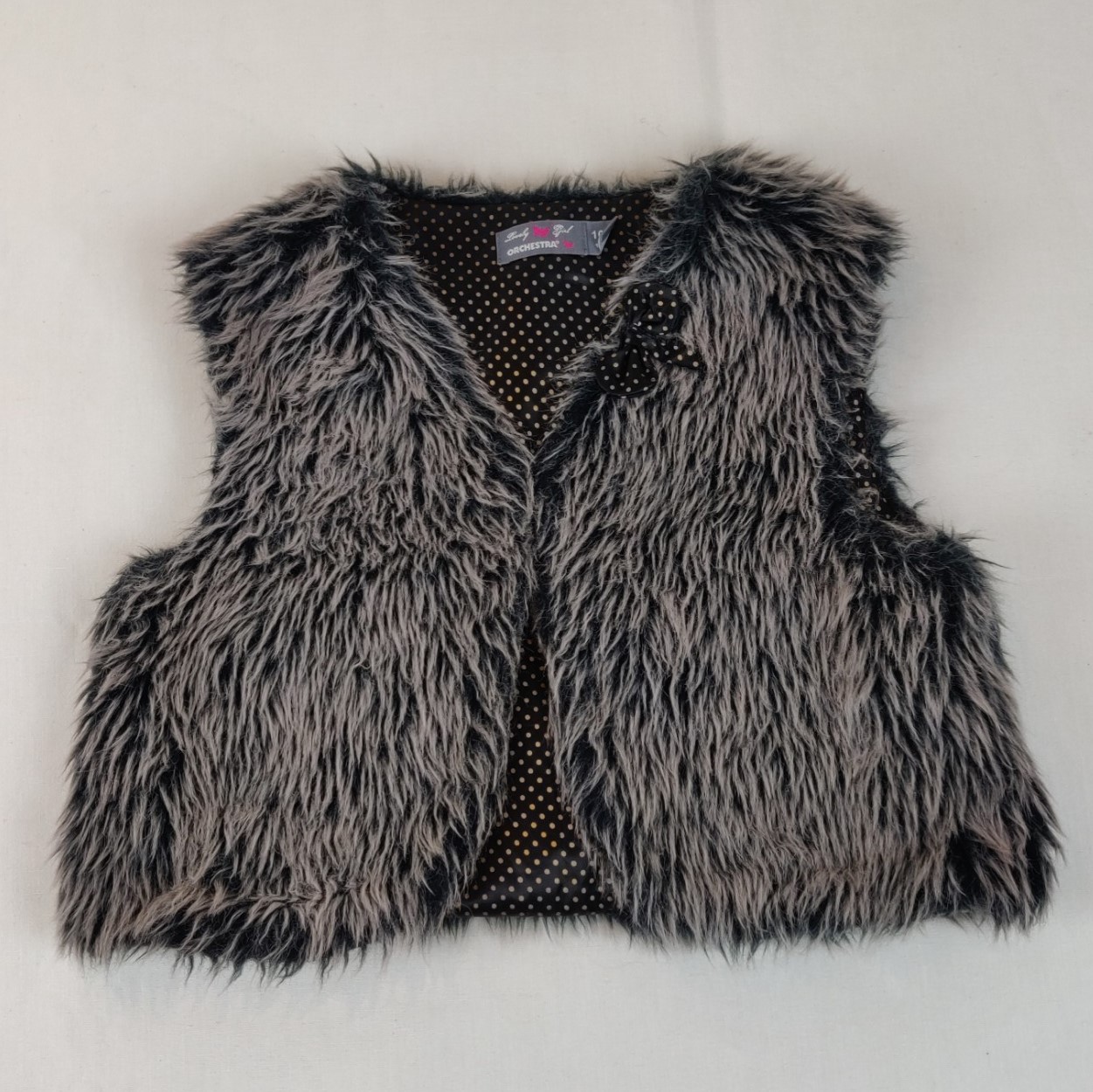 Autres commentaires : Gilet sans manche en fourrure synthétique marron et noire. Fermeture centrale à un crochet. Noeud décoratif noir à pois dorés.