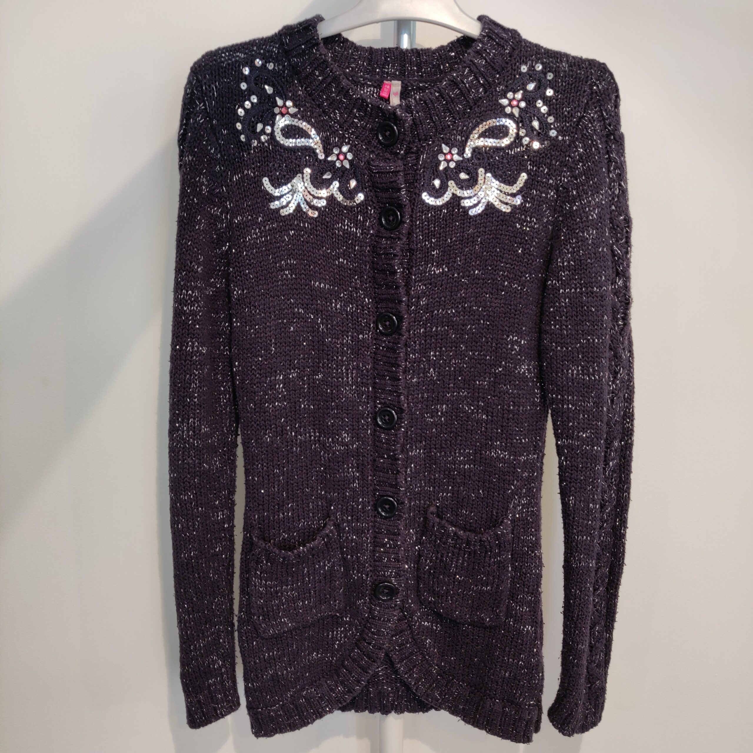 Autres commentaires : Gilet long à boutons classiques bleu très foncé avec fils argentés et décor floral en sequins