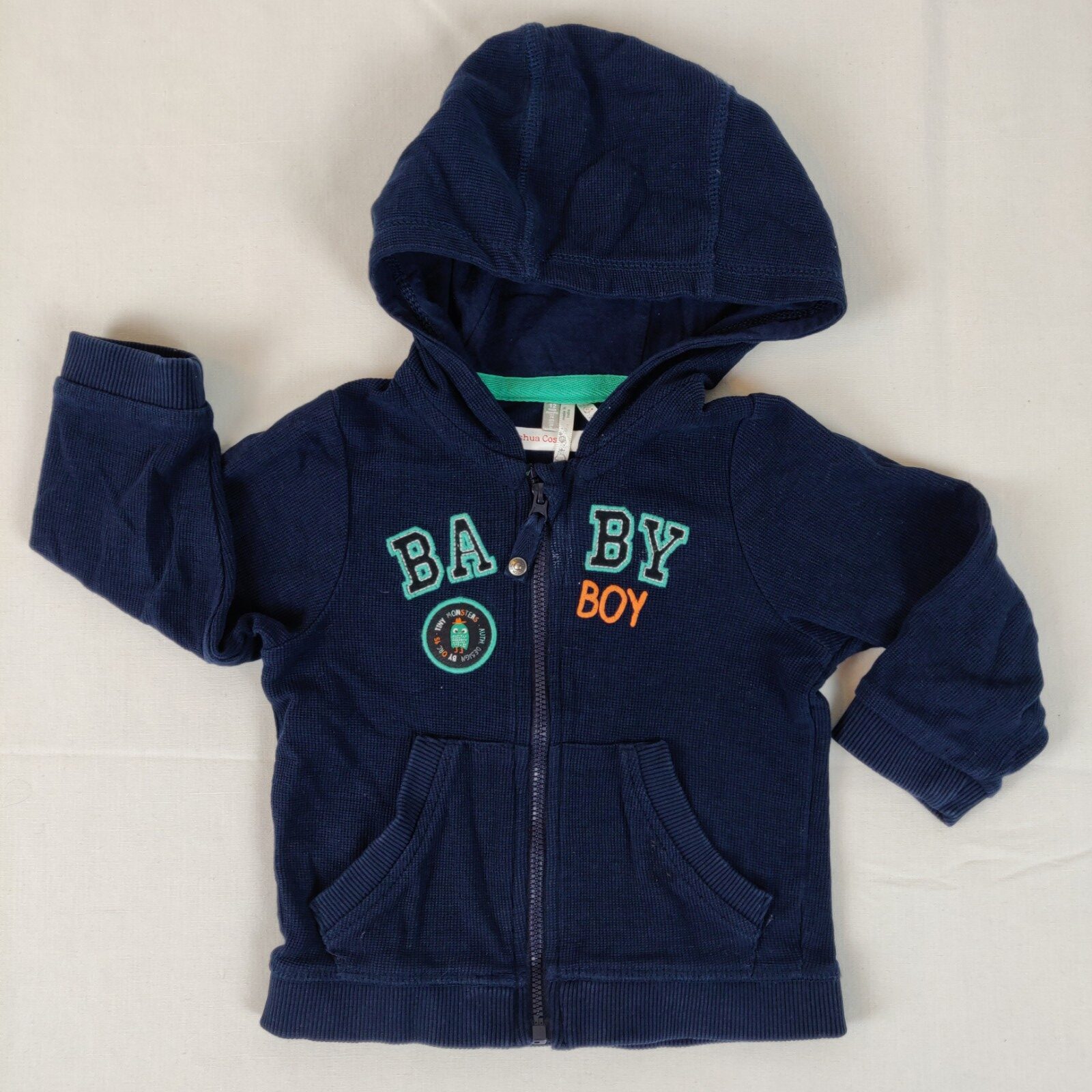 Autres commentaires : Gilet à capuche – bleu marine avec inscription « Baby boy » et écusson hibou cousu – ouverture centrale à fermeture éclair . 2 poches latérales. Petite tâche vers le haut de la fermeture éclair.