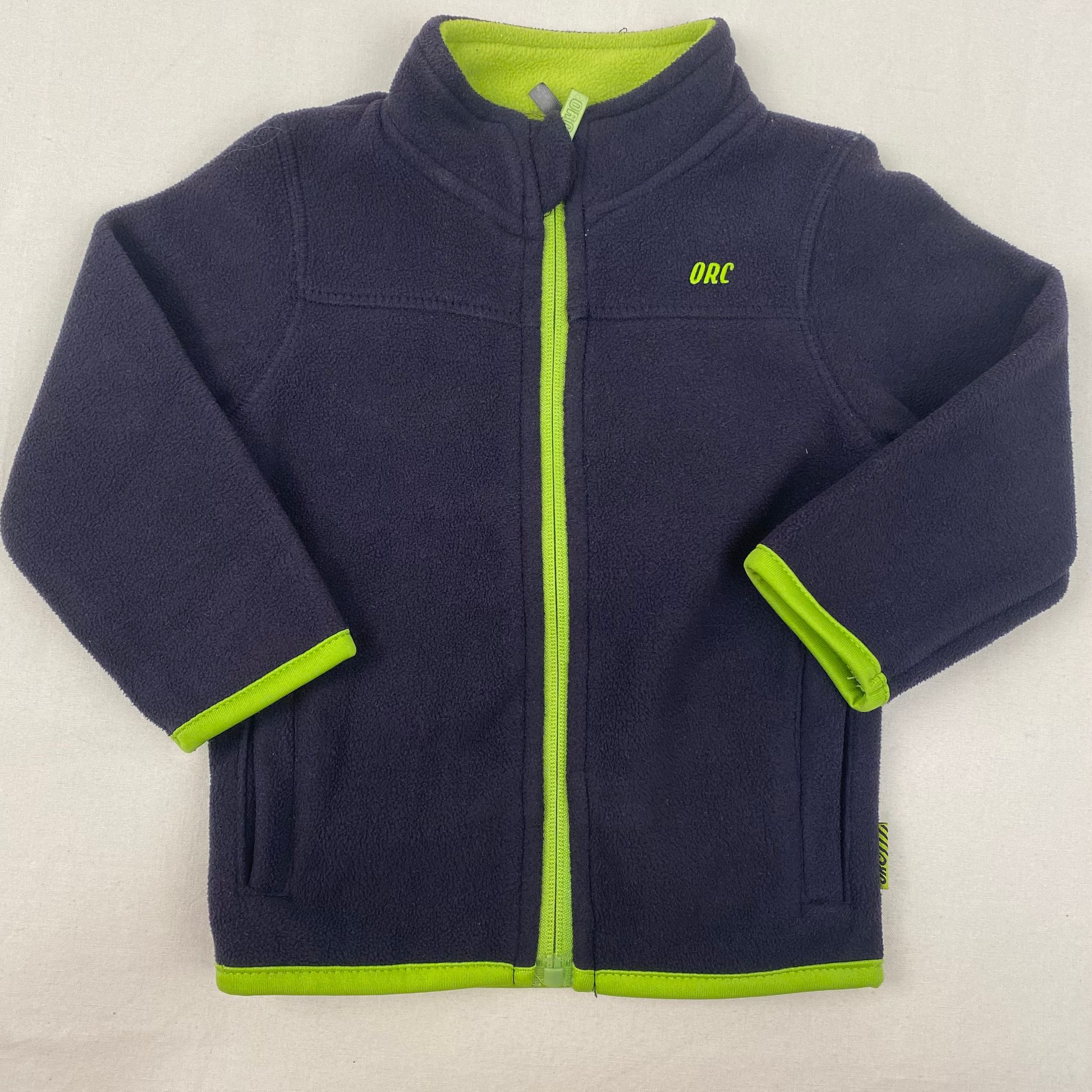 Autres commentaires : Gilet bleu marine type polaire avec fermeture à zip verte et inscription « ORC » à l’avant.