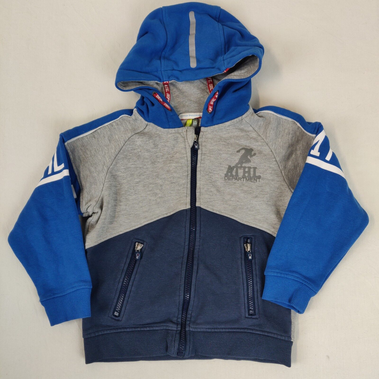 Autres commentaires : 20% polyester. Gilet à capuche tricolore. Partie supérieure gris chiné, partie inférieure bleu marine, manches et capuche bleues. Motif central coureur accompagné de l’inscription « Athl Department ». Inscription blanche « Athl Dept »à la manche droite. Inscription blanche « Campus » à la manche gauche. Ouverture centrale zippée. 2 poches latérales à zip.