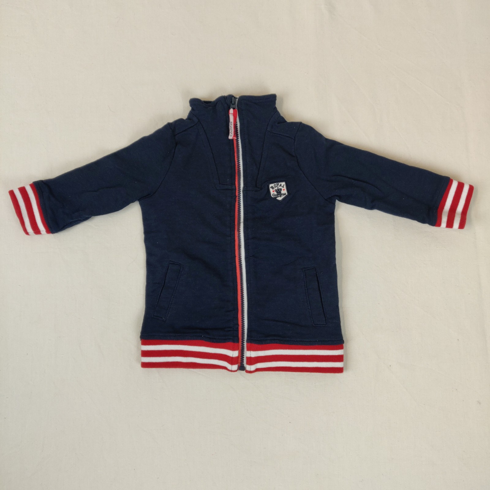 Autres commentaires : 22% polyester. Un gilet – bleu marine. Col montant. Ecusson central blanc avec inscription « Royal campus ». Ouverture centrale blanche et rouge zippée. 2 poches latérales. Poignets et taille façon tricot élastique rouge avec deux bandes blanches.