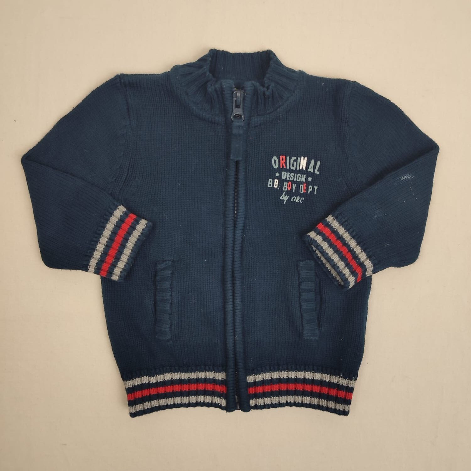 Autres commentaires : Gilet tricoté bleu foncé, fermeture par zip, bordures côtelées à rayures rouges et grises, col cheminée.