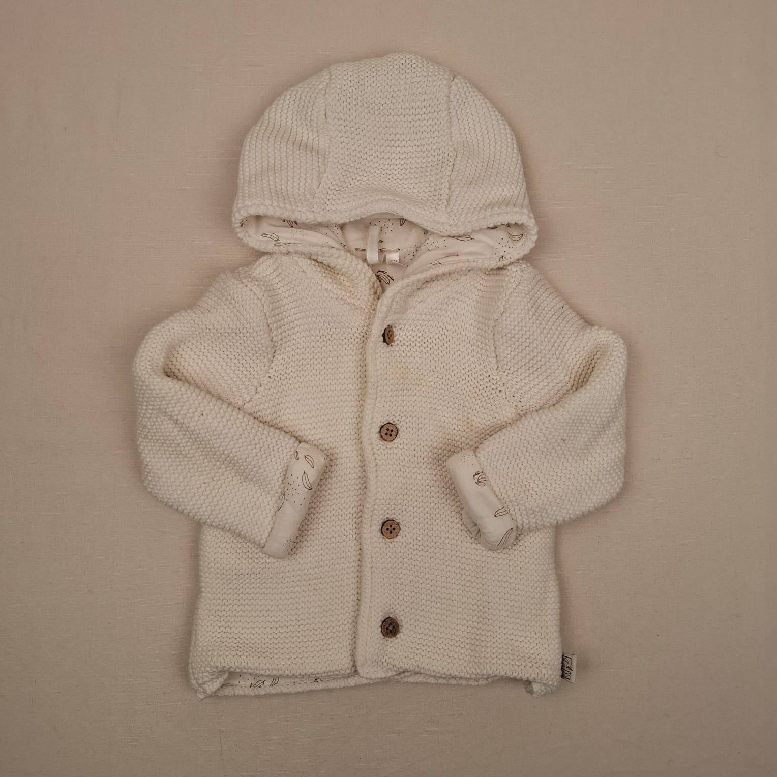 Autres commentaires : Gilet à manches longues et capuche en maille, fermeture par boutons, attention traces jaunies qui devraient partir au lavage, niveau réduit de fraise à myrtille